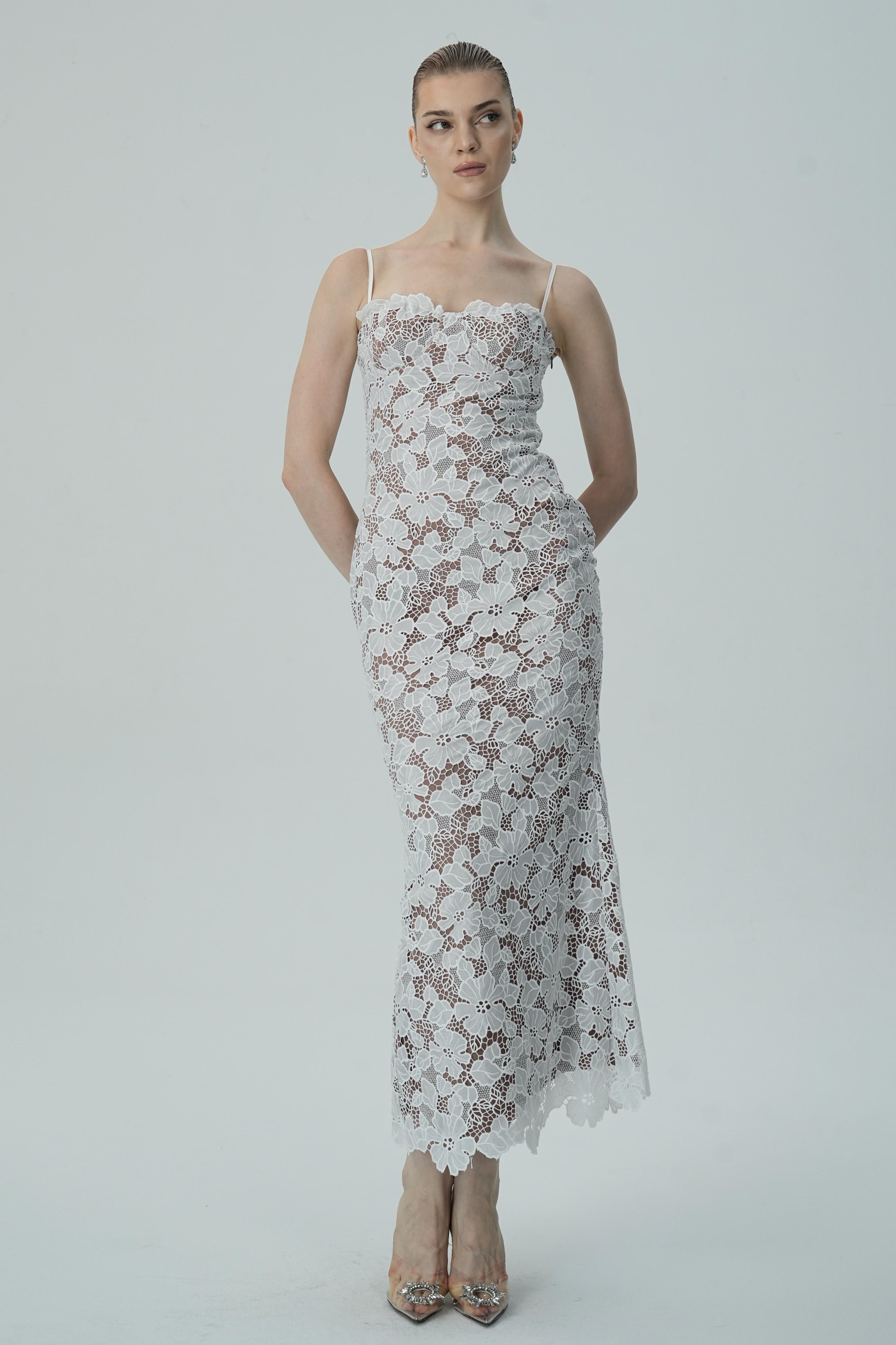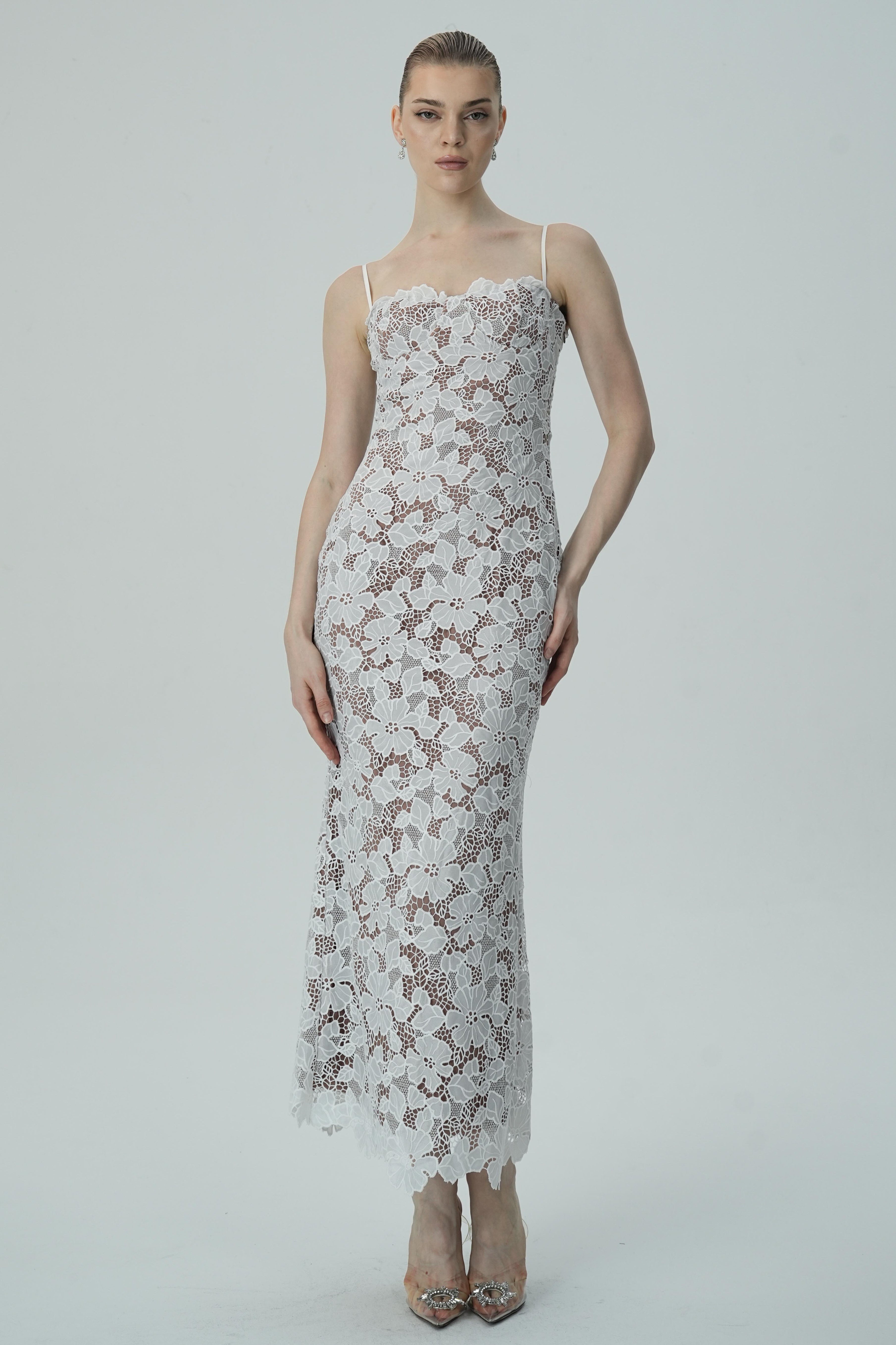 Beyaz Çiçekli Dantel Spagetti Askılı Elbise