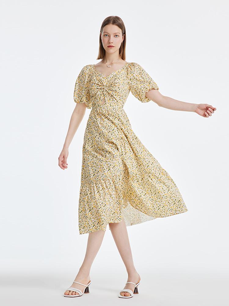 Çiçek Desenli Balon Kol Elbise