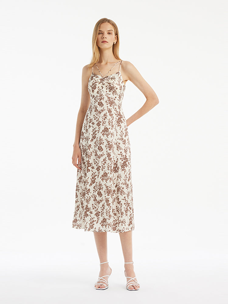 Çiçek Desenli Kadın Midi İnce Askılı Elbise