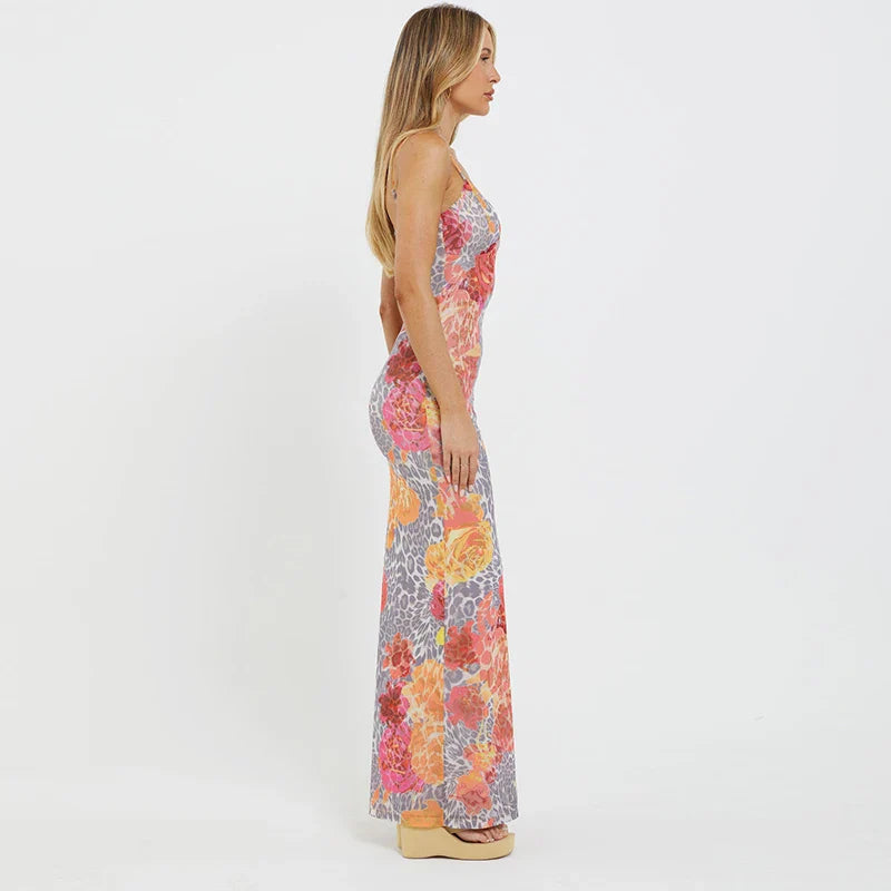 Çiçek Desenli Ayarlanabilir Halter Uzun Elbise