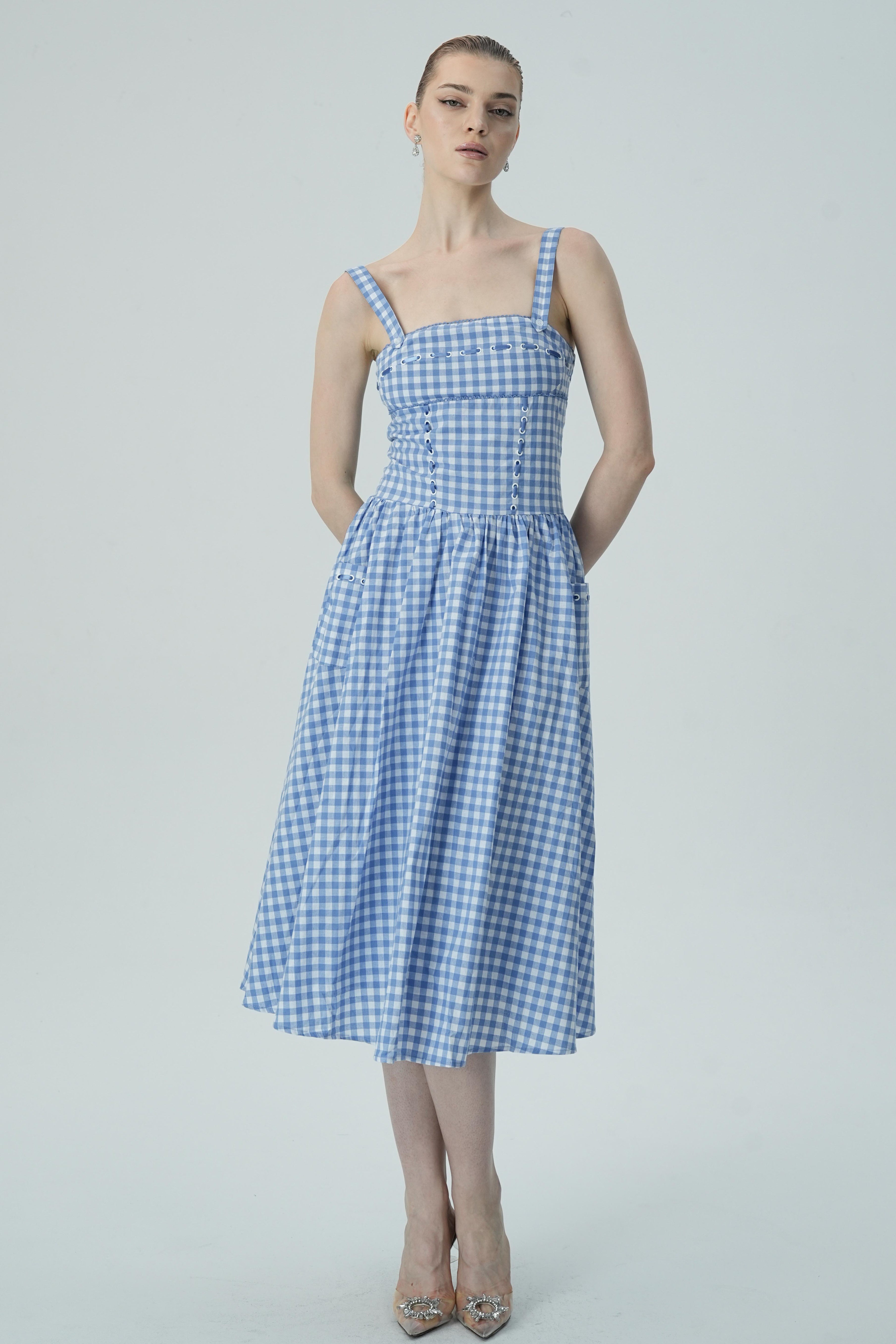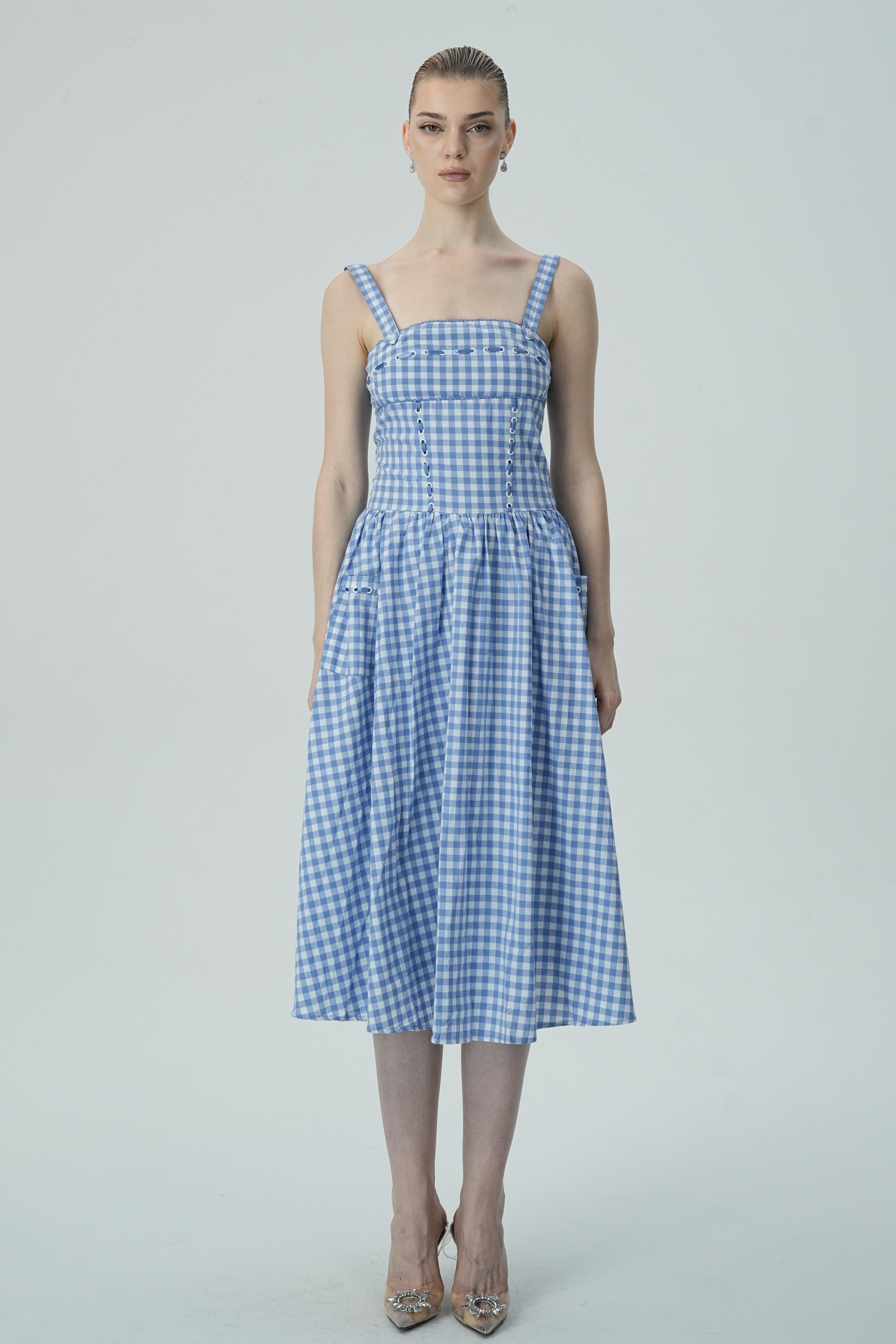 Bağcık Detaylı Mavi Pötikare Midi Elbise