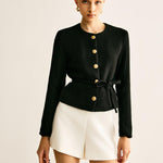 Eternal Elegance Blazer, zarafeti ve minimalizmi bir araya getiren modern bir tasarımdır. Bel kısmındaki ince bağlama detayı, vücut hatlarını zarifçe vurgularken klasik bir blazer ceket görünümüne özgünlük katar. Altın düğmeleriyle sofistike bir stil sunan bu blazer, hem gündüz hem de gece kombinleriniz için ideal bir seçimdir.
