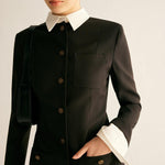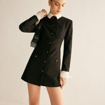Zarif bir tasarıma sahip bu siyah mini blazer elbise, beyaz kontrast manşetleri ve altın düğme detaylarıyla şıklığı yeniden tanımlıyor. Özel davetlerde veya iş şıklığında fark yaratmak isteyenler için mükemmel bir seçim!