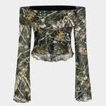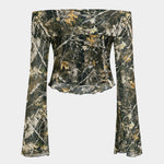 Branch Print Mesh Off Shoulder Uzun Kollu Üst