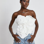 Flora Elegance Beyaz 3D Çiçek Detaylı Straplez Bluz