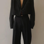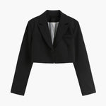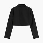 Modern ve şık bir görünüm için tasarlanan siyah crop blazer ceket, kısa kesimi ve zarif detaylarıyla dikkat çekiyor. Hem iş hayatında hem de özel davetlerde stilinize sofistike bir dokunuş katacak mükemmel bir seçenek!