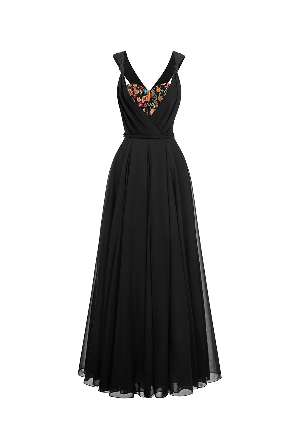 Siyah Çiçek Desenli Uzun Şifon Elbise