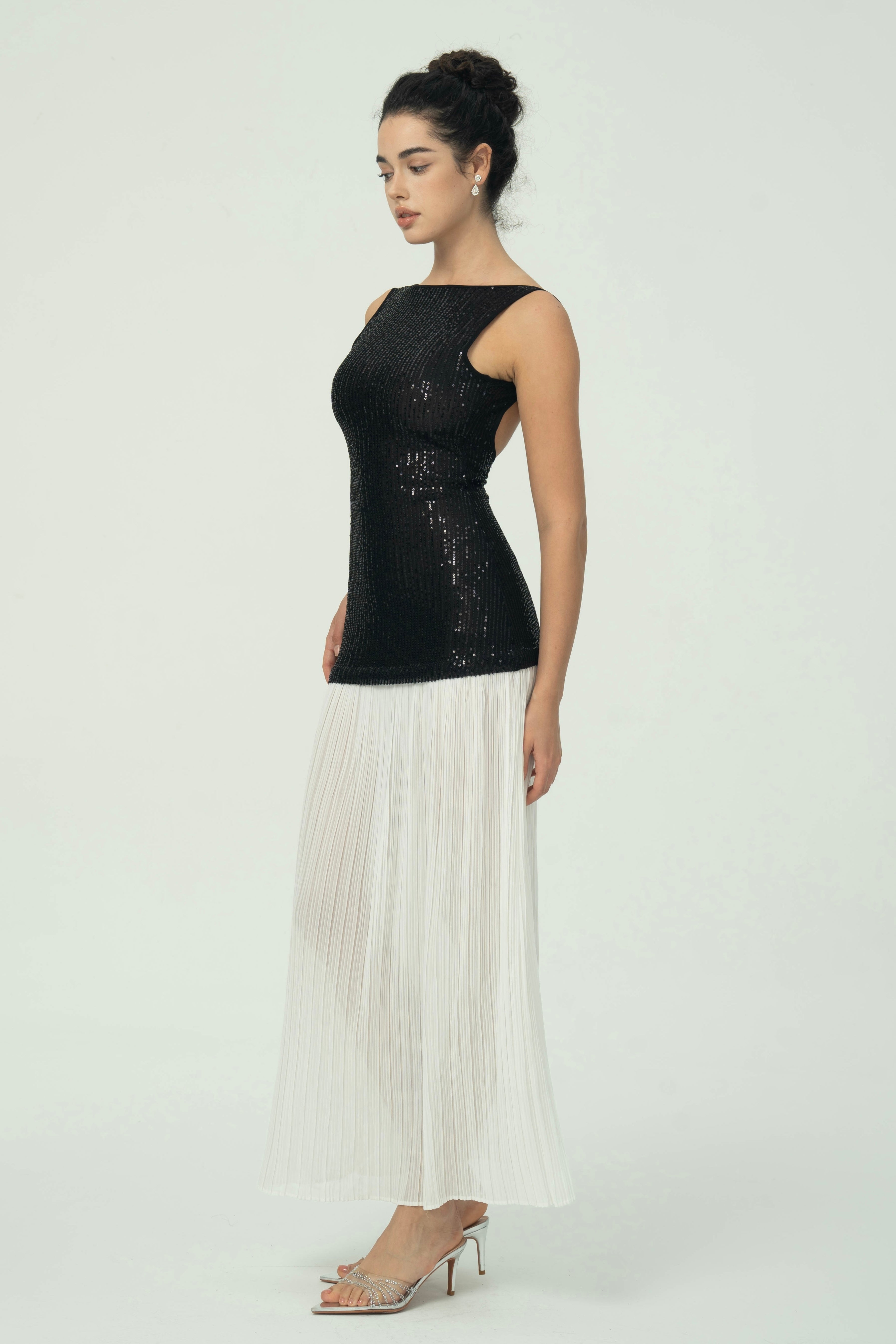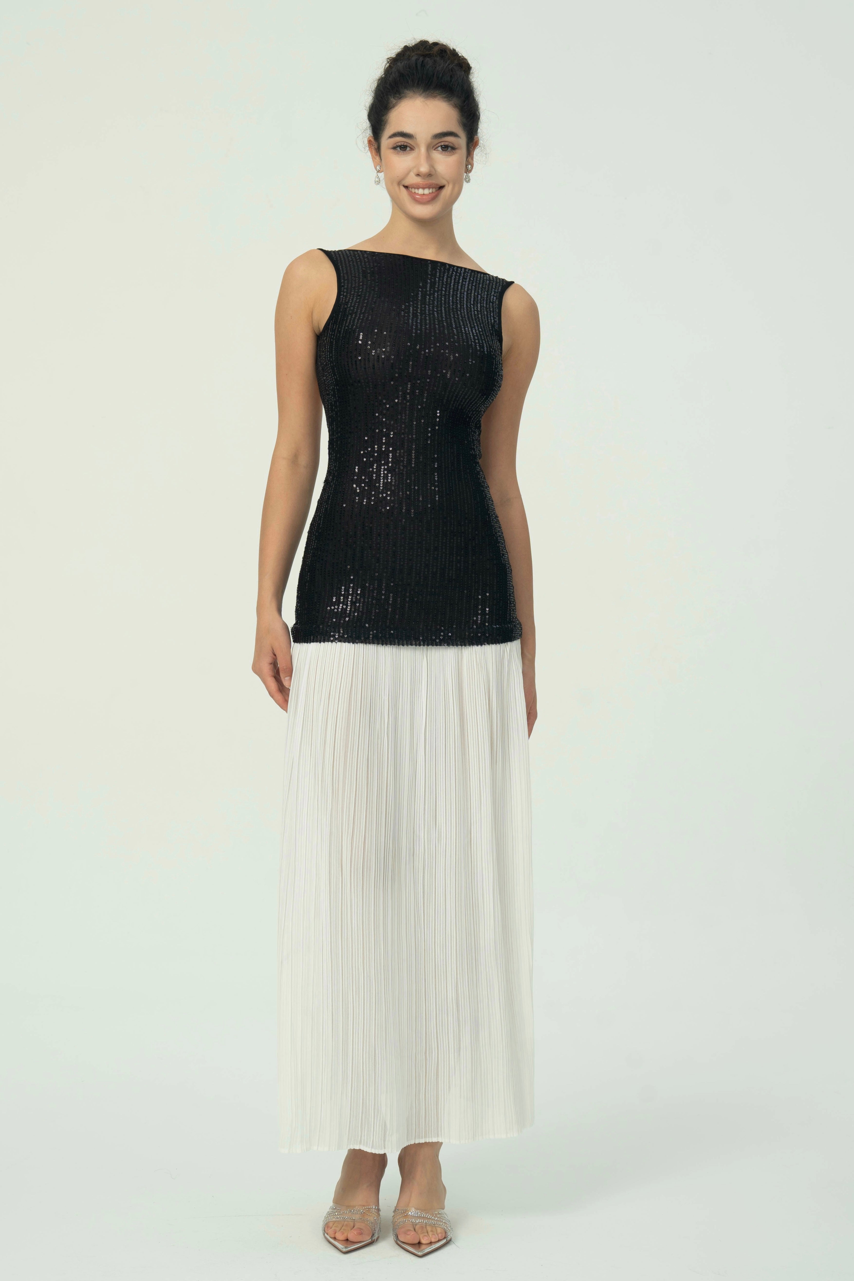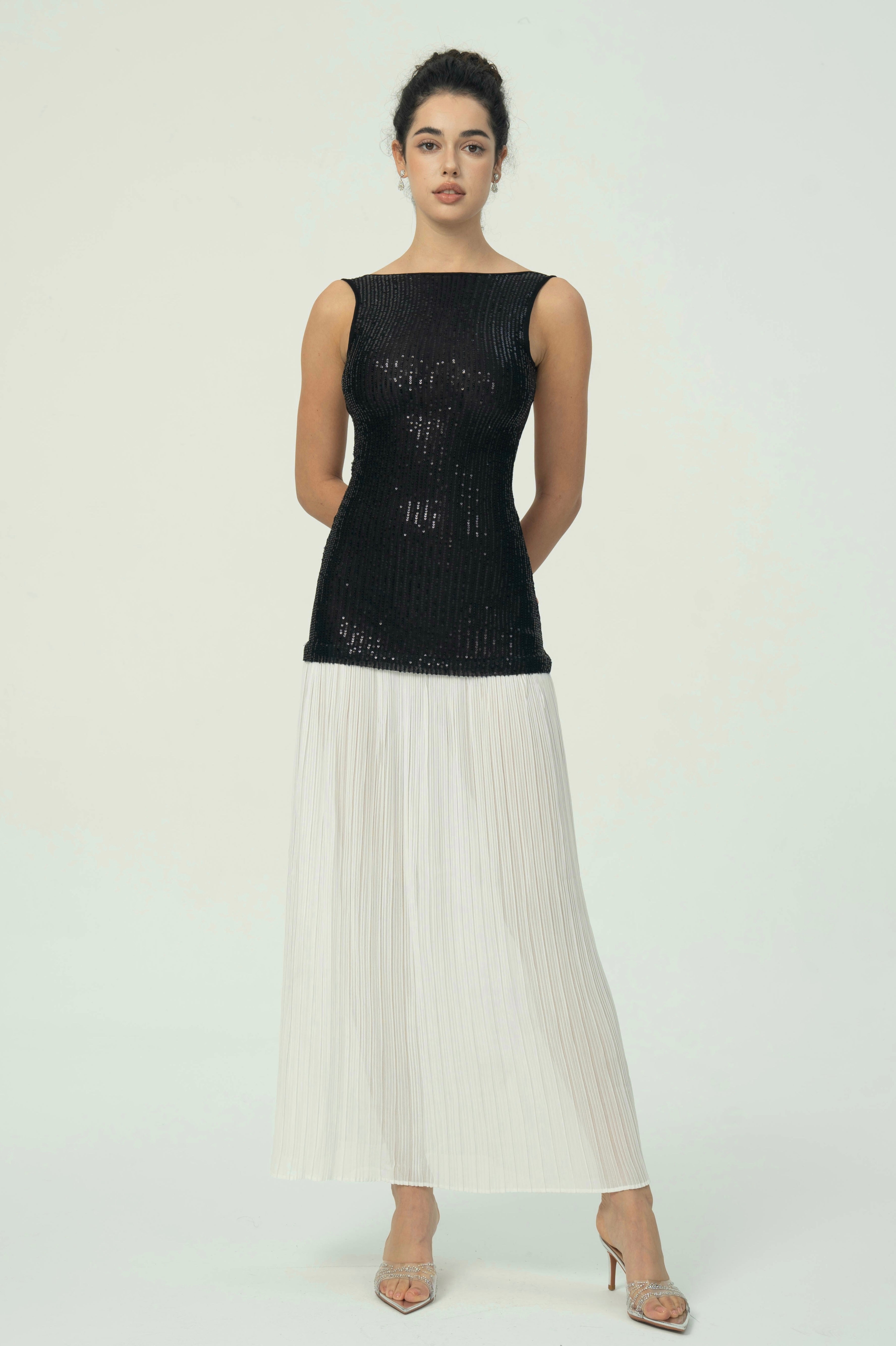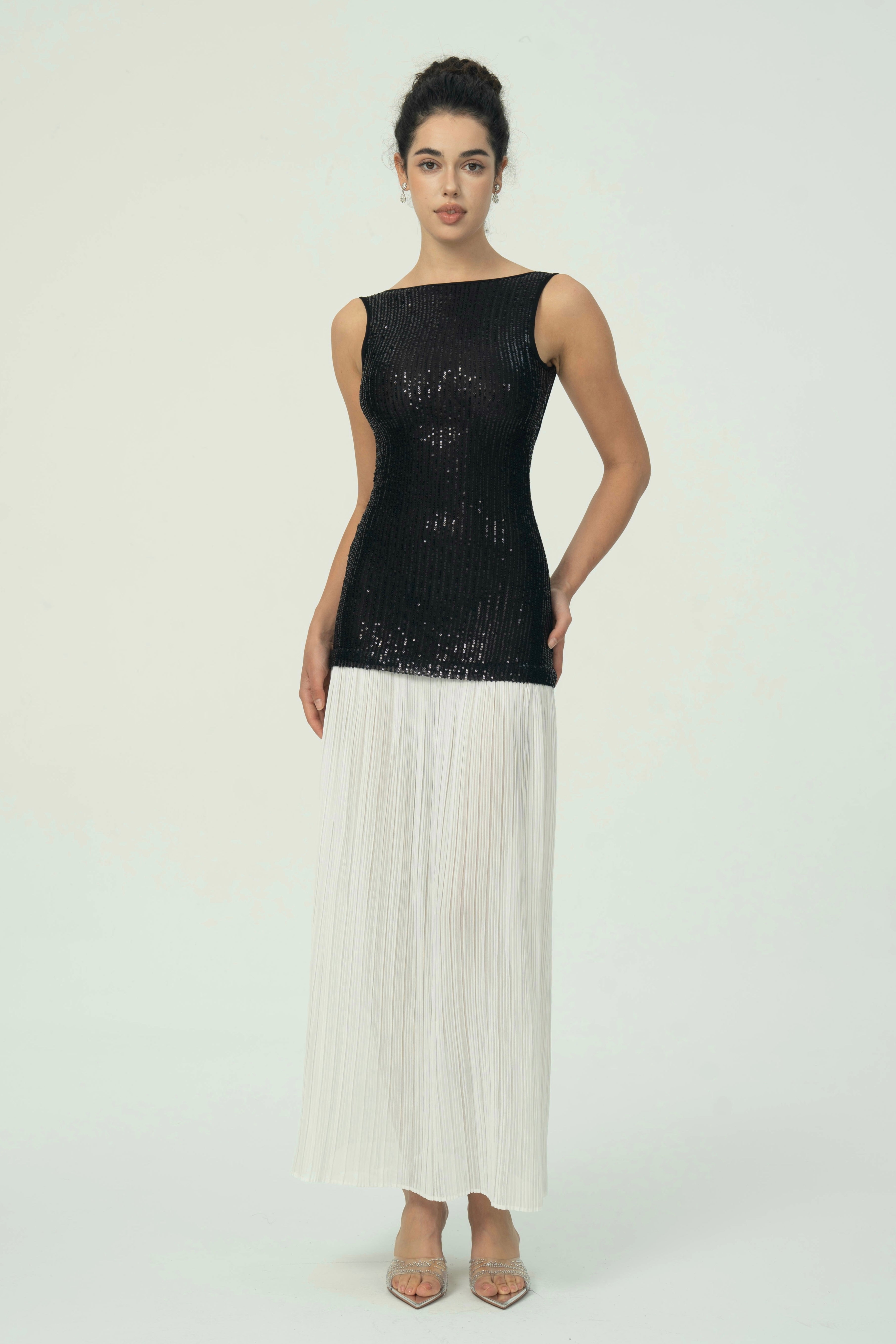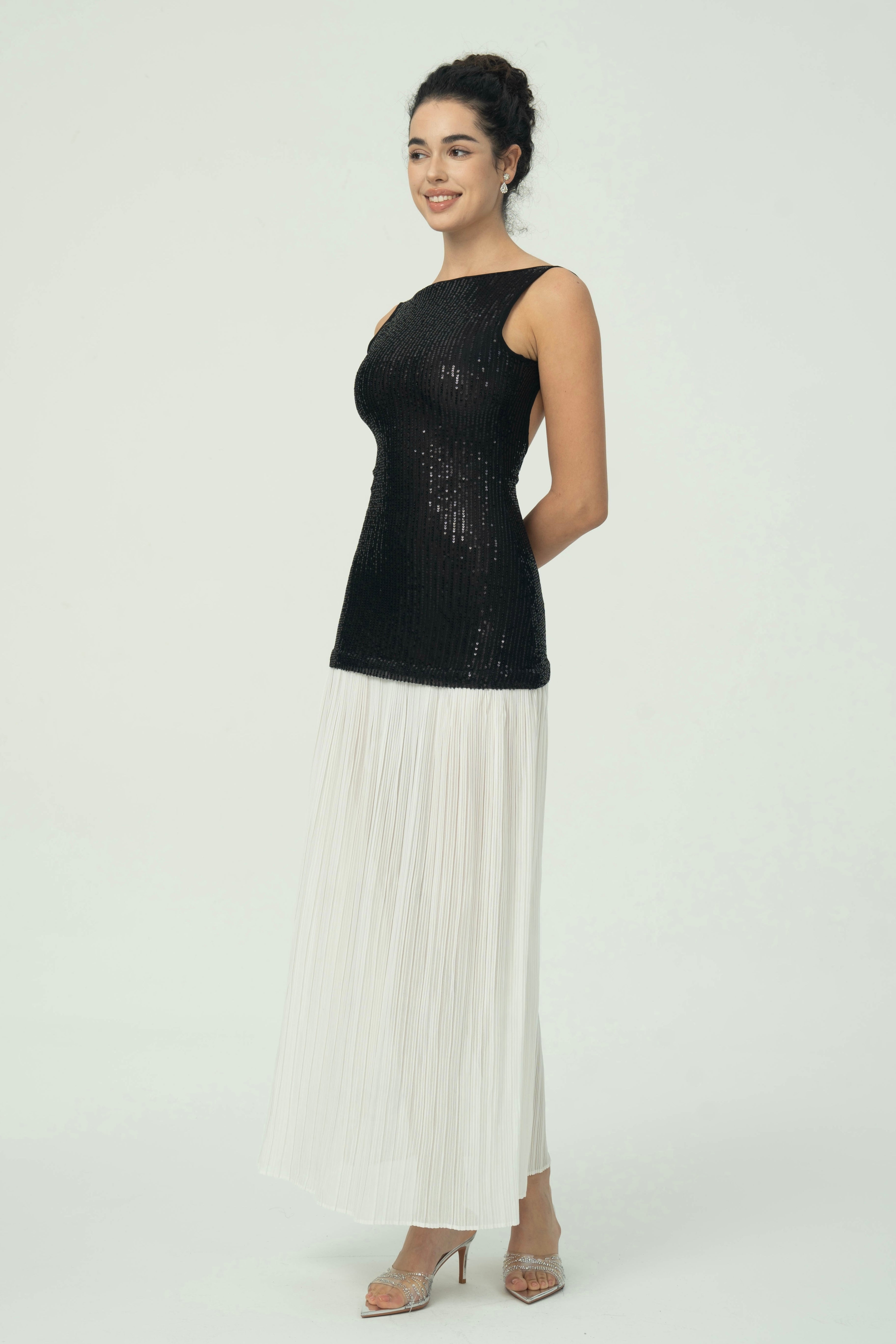 Siyah Payet Üst & Beyaz Pileli Maxi Etekli Elbise – Zarif ve Modern