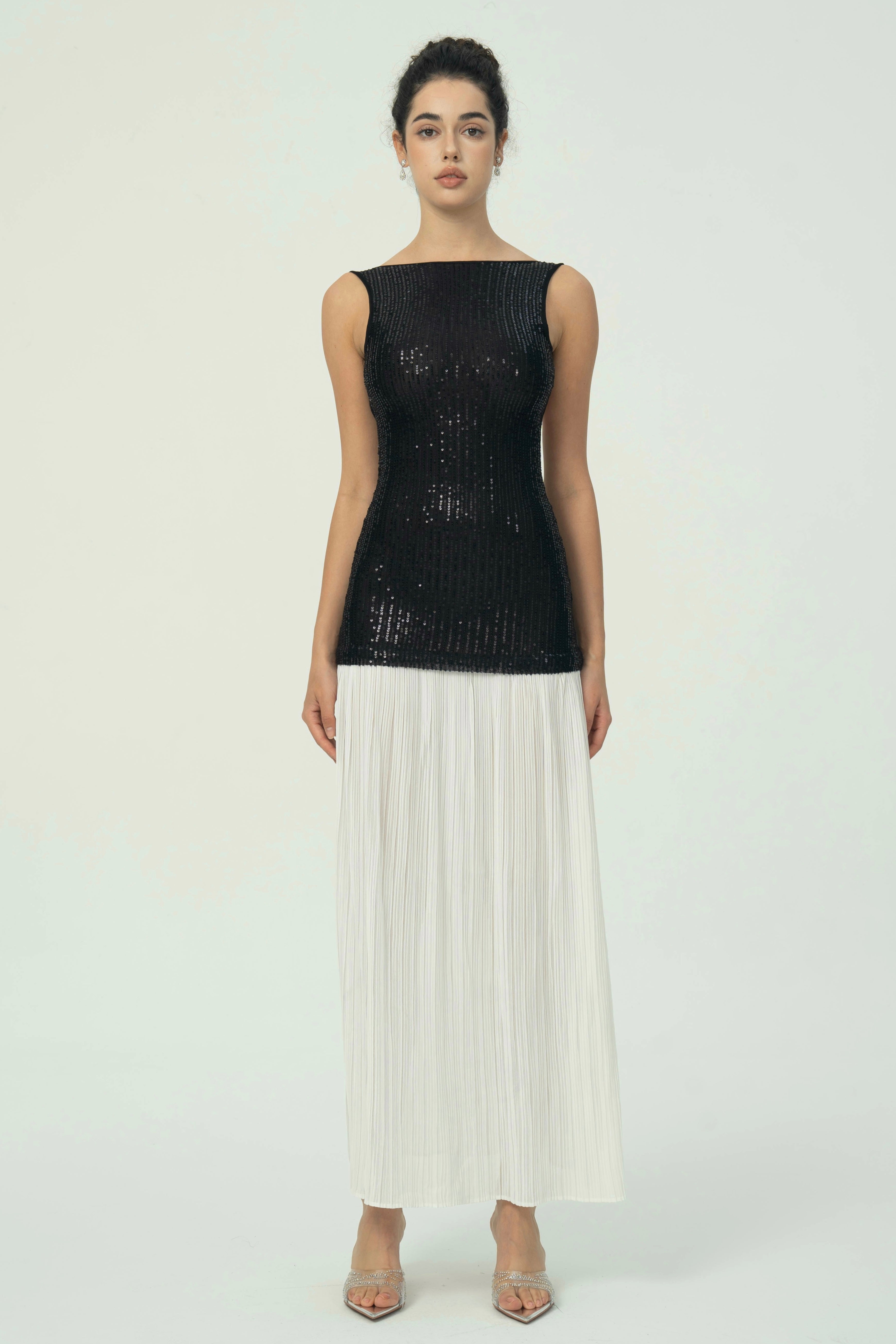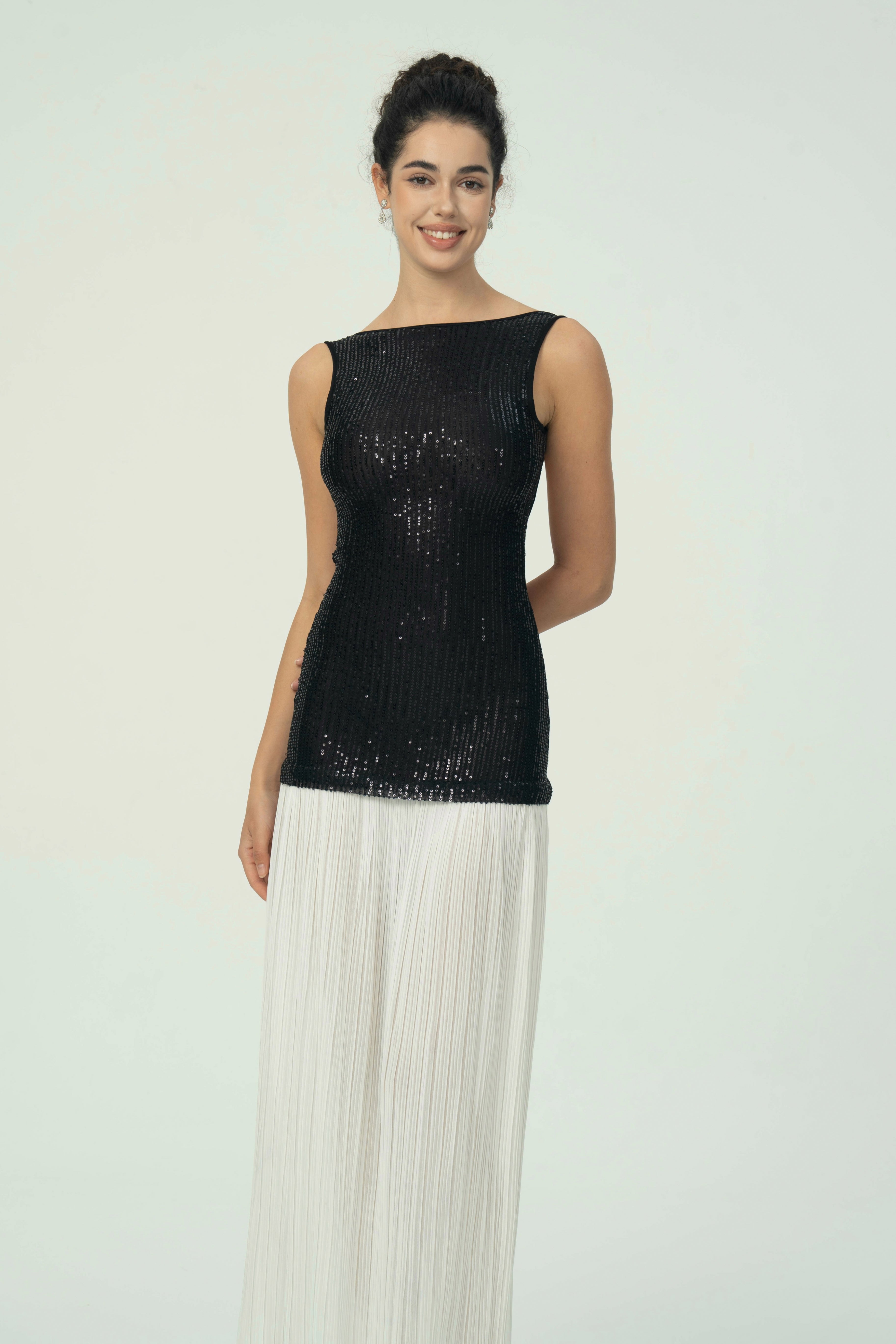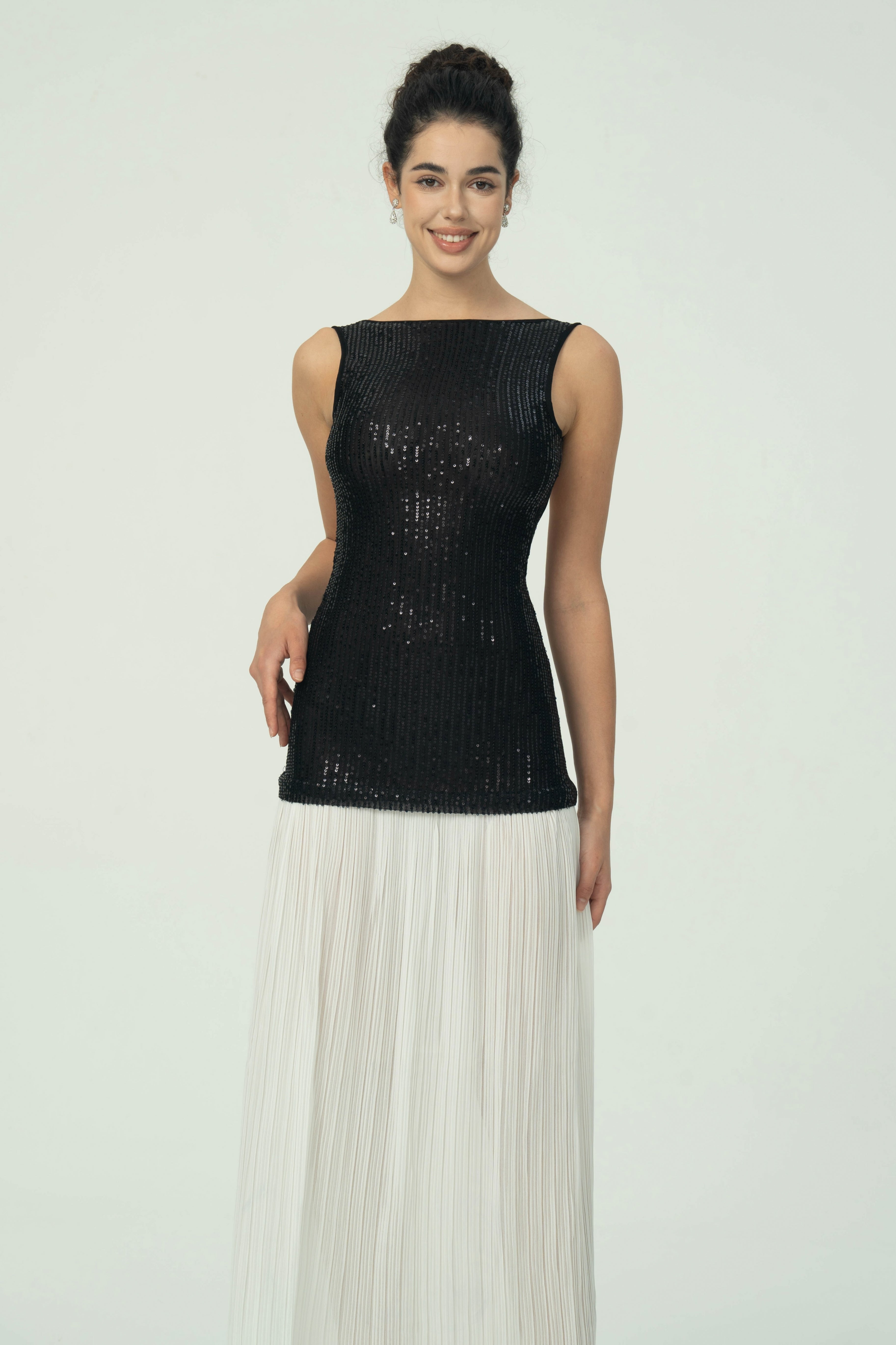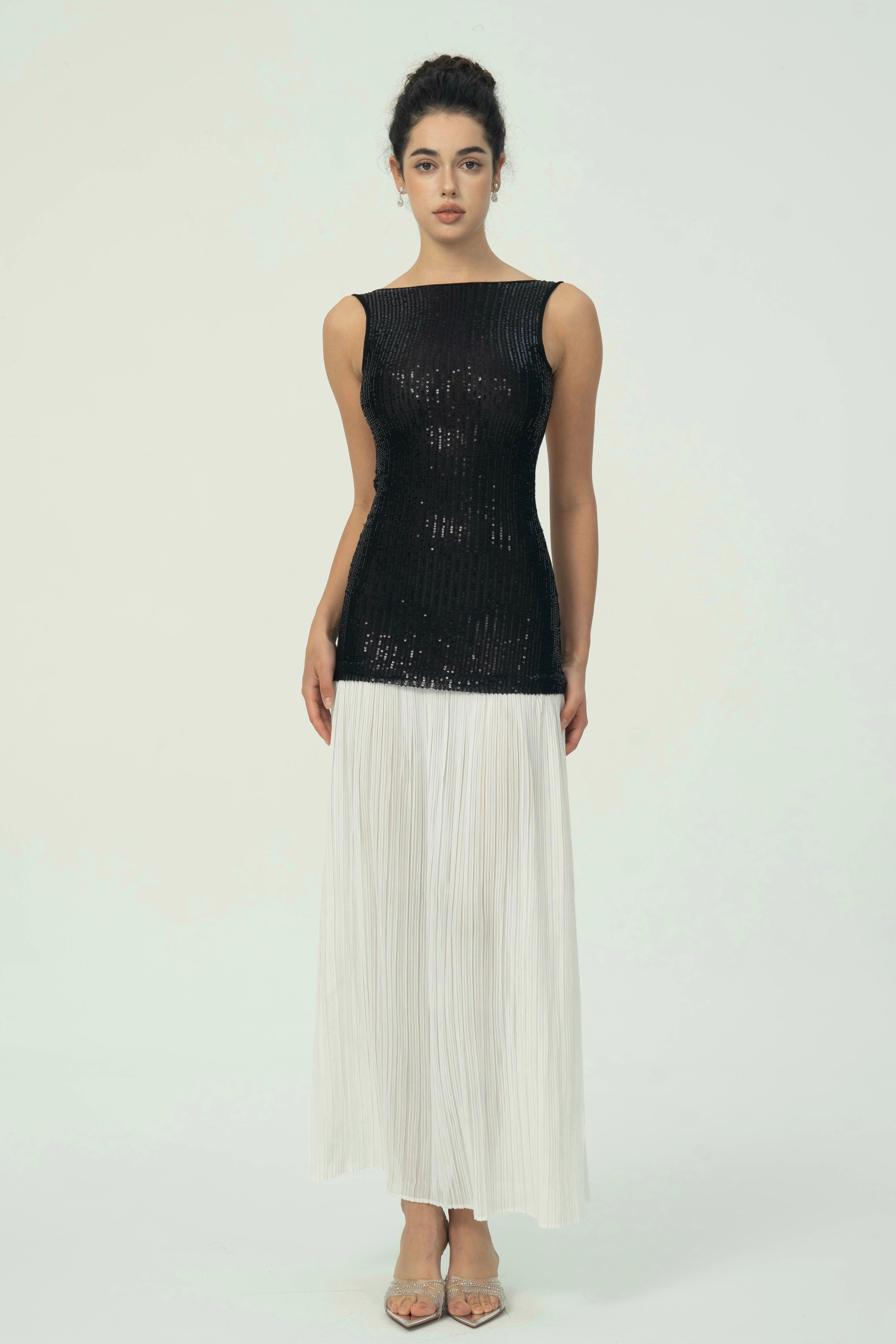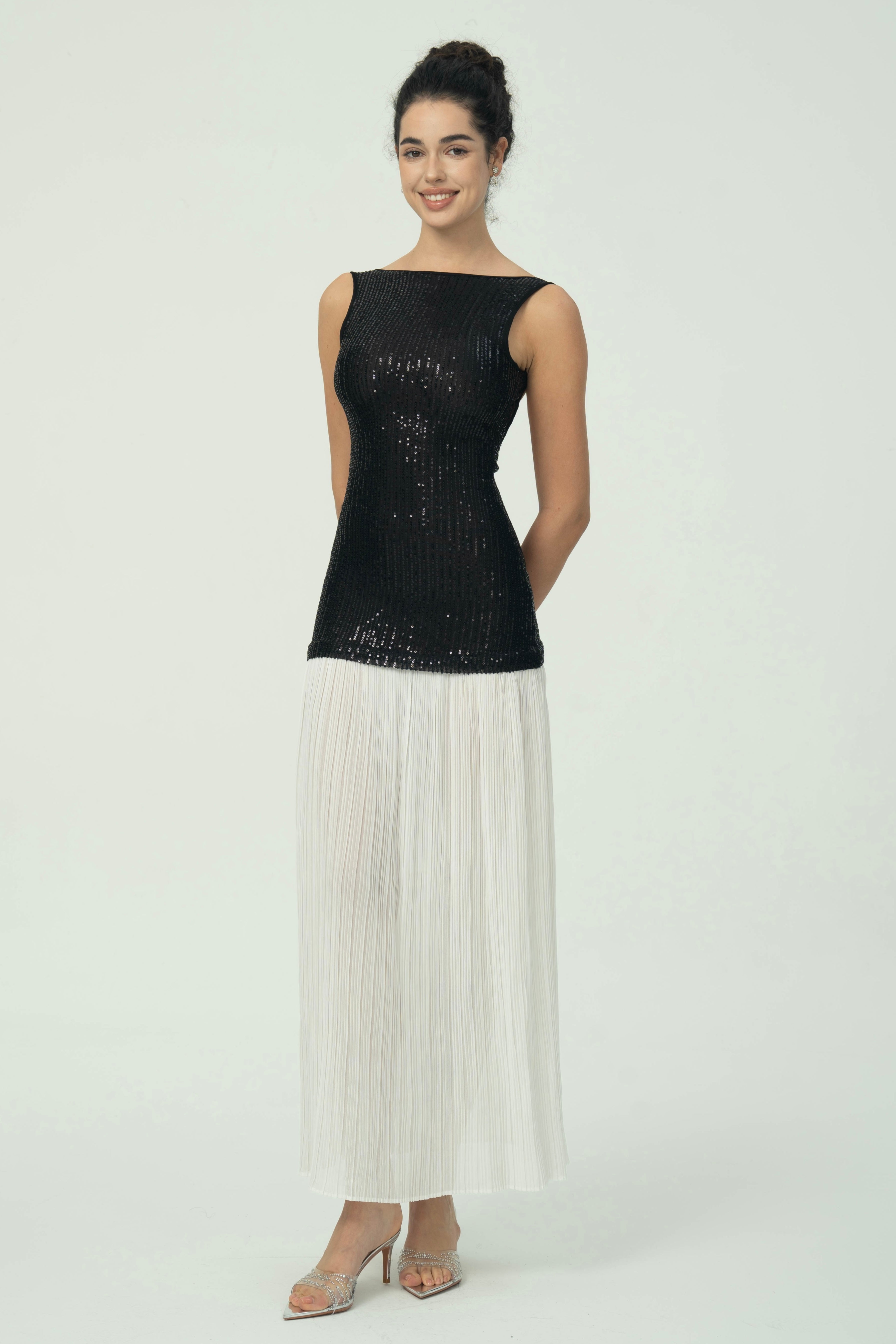 Siyah Payet Üst & Beyaz Pileli Maxi Etekli Elbise – Zarif ve Modern