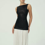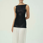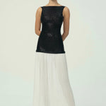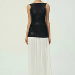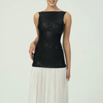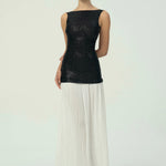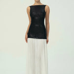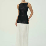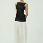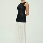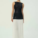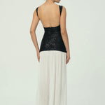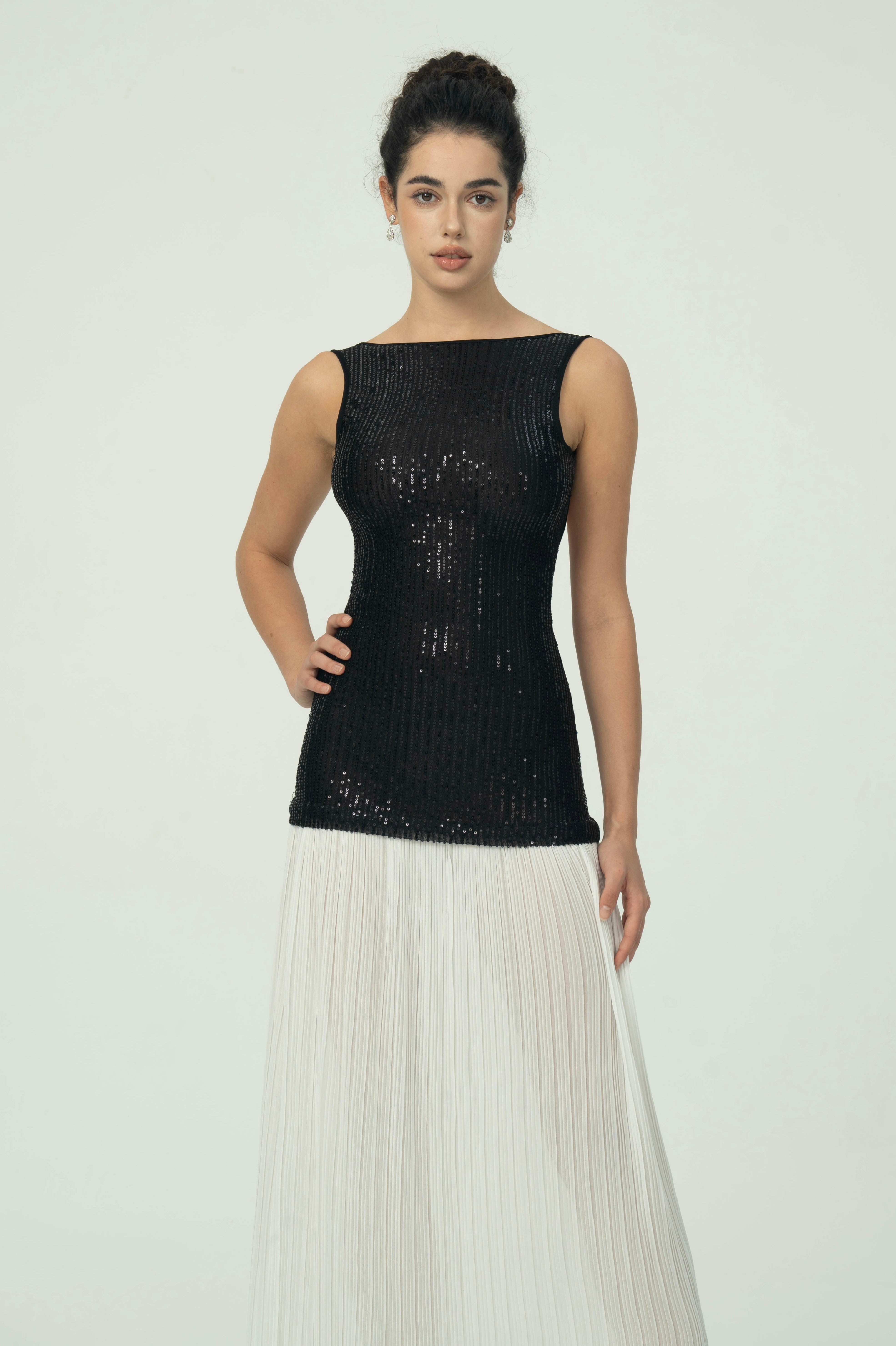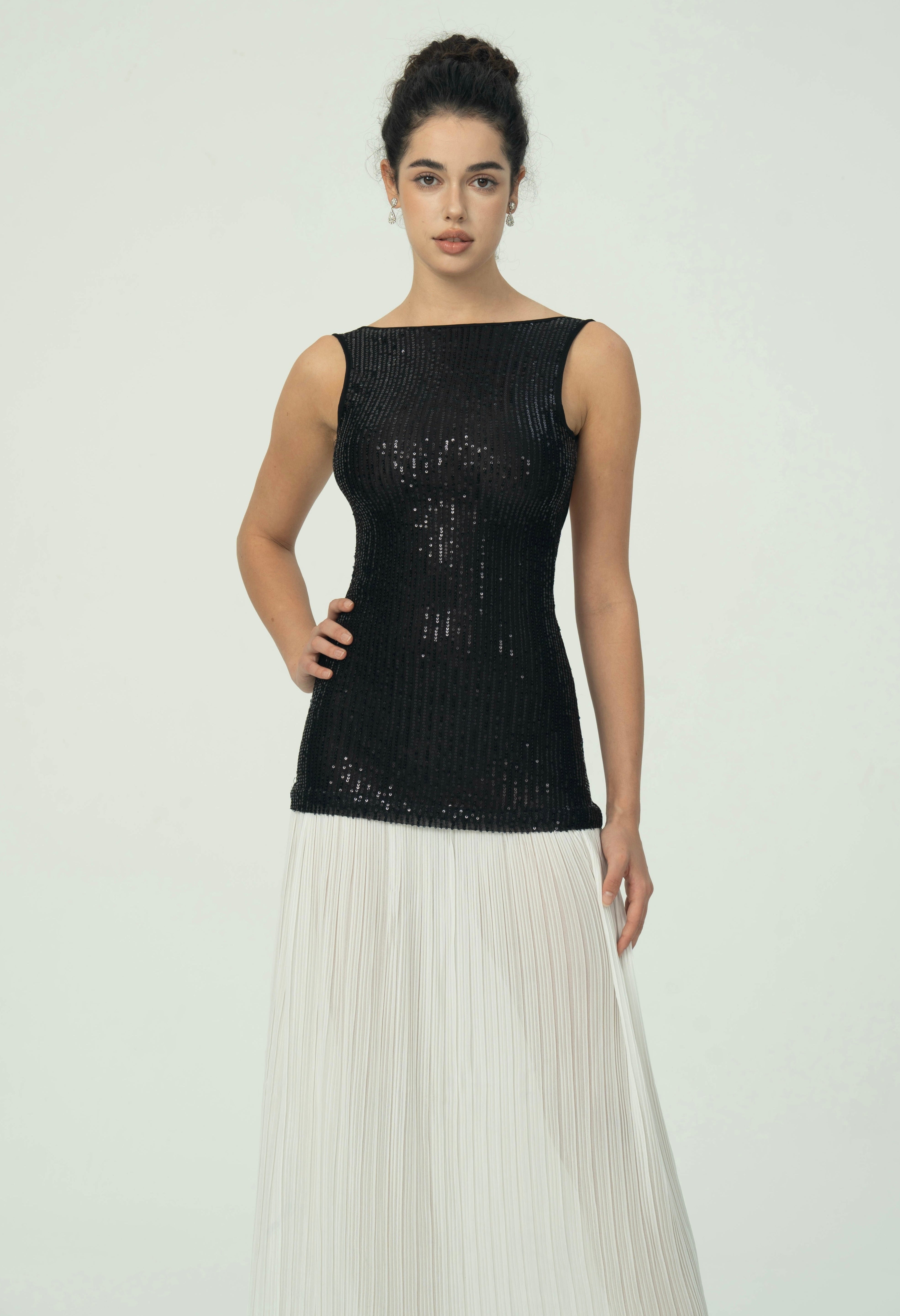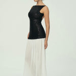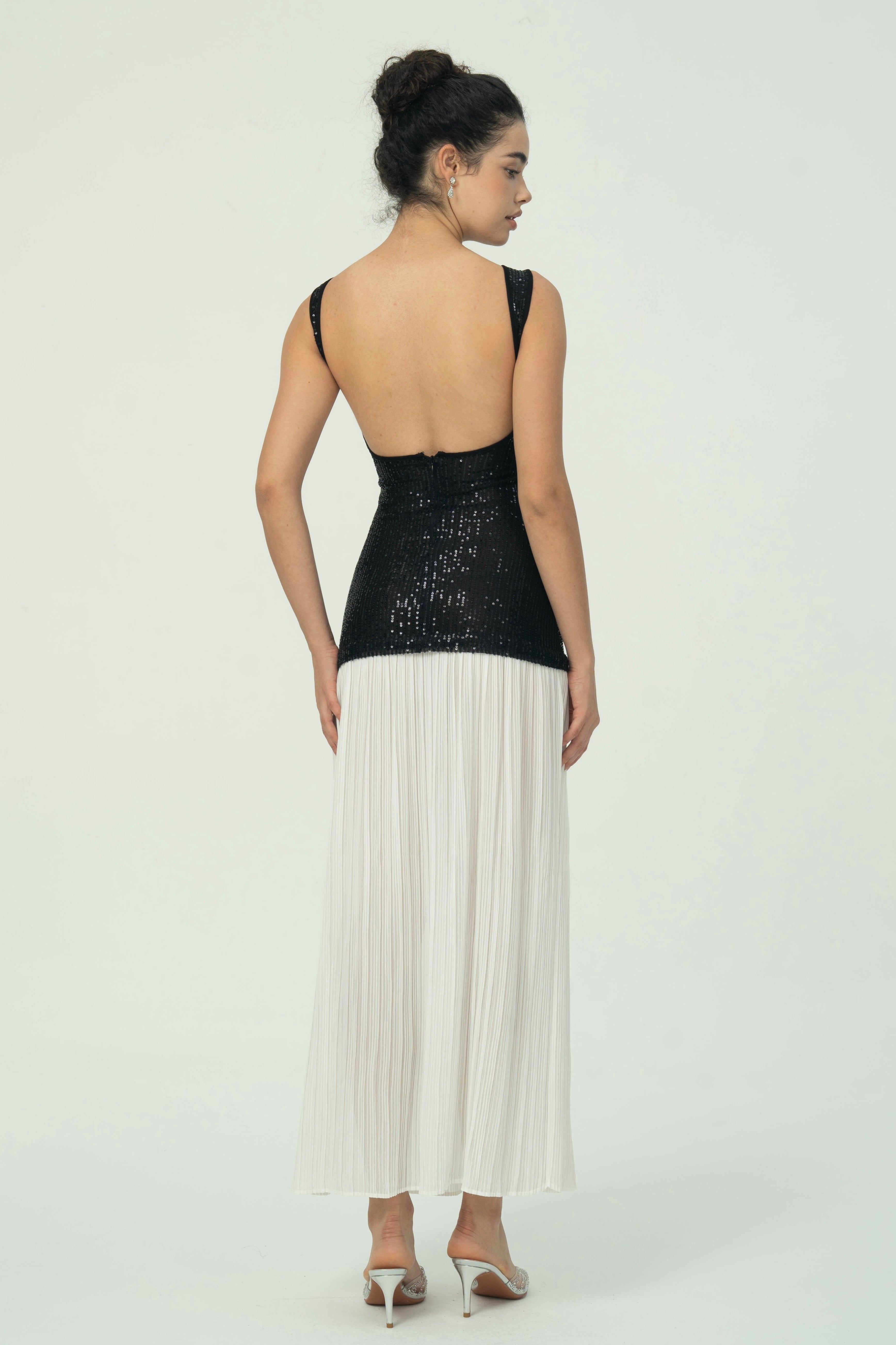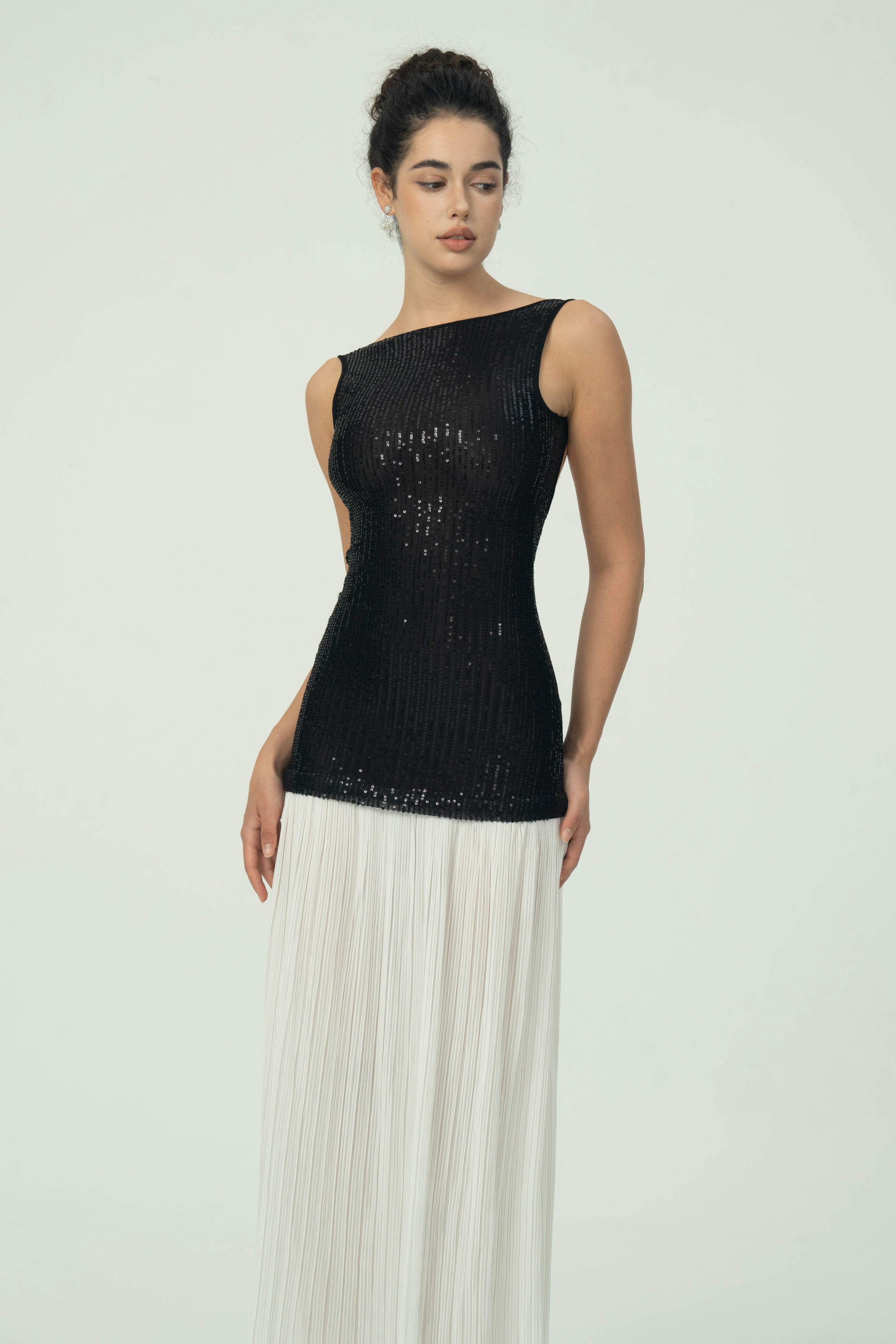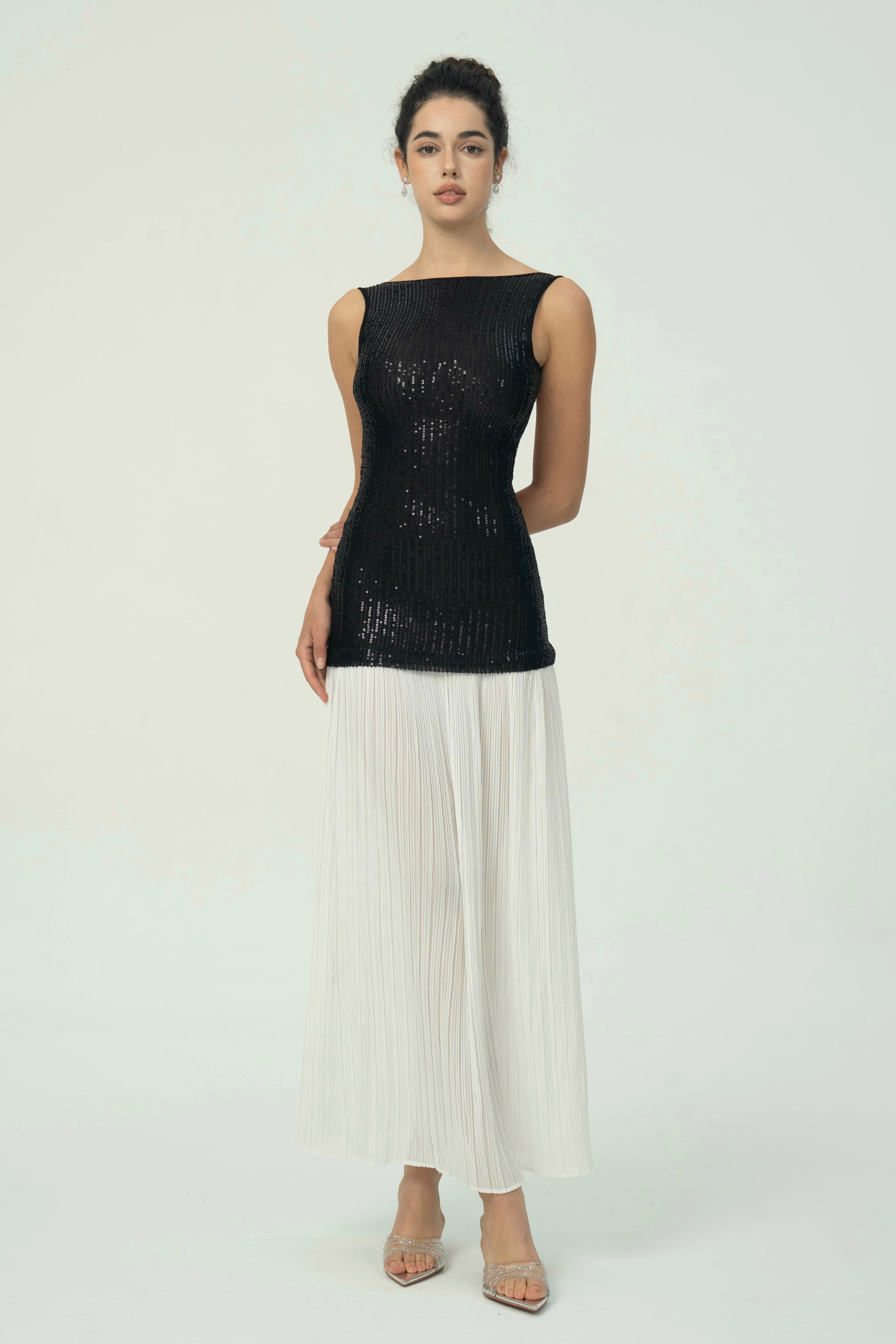 Siyah Payet Üst & Beyaz Pileli Maxi Etekli Elbise – Zarif ve Modern