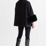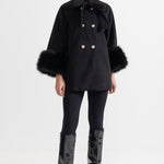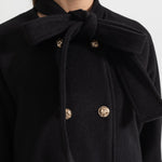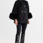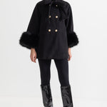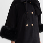 Klasik zarafeti modern detaylarla buluşturan bu siyah kaban, çift düğmeli tasarımı ve altın rengi düğme süslemeleriyle dikkat çeker. Yaka kısmındaki zarif kurdele feminen bir dokunuş katarken, lüks kürk manşetler tasarıma sofistike bir hava kazandırır. Tam boy kollu yapısıyla şıklığı ve işlevselliği bir arada sunar.