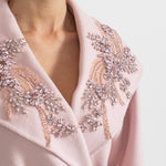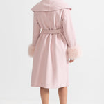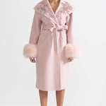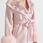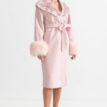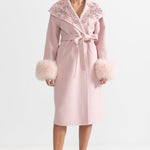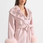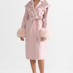 Romantik ve sofistike detaylarıyla öne çıkan bu pembe kaşmir kaban, zarif çizgileri ve lüks dokusuyla seçkin bir görünüm sunuyor. Midi boy uzunluğu (117 cm) ile modern bir siluet kazandırırken, ön kısmındaki 3D çiçek işlemeleri ve yakadaki zarif nakışlar tasarıma sanatsal bir dokunuş katıyor. Geniş yakalar ve kabarık kürk manşetler, kabanın şıklığını öne çıkarırken, ayarlanabilir bel kuşağı vücuda oturan feminen bir form oluşturuyor. Kaşmir ve yün karışımlı premium kumaşıyla sıcaklık ve konforu bir arada sunuyor.
