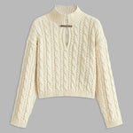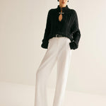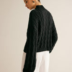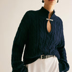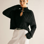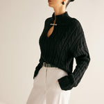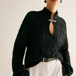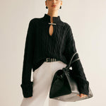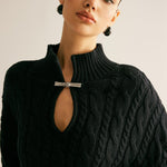 Şık örgü deseni ve metal toka detayıyla dikkat çeken bu siyah kazak, kış aylarında stilinize modern bir dokunuş katıyor. Hem rahat hem de göz alıcı kombinler için ideal bir parça!