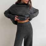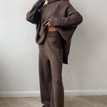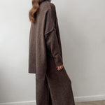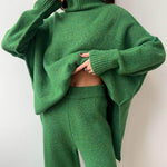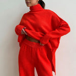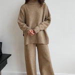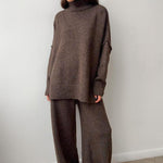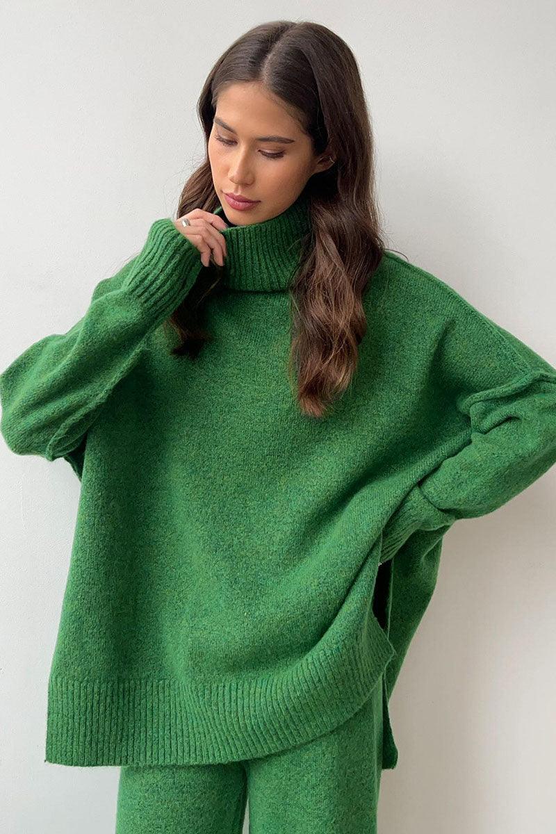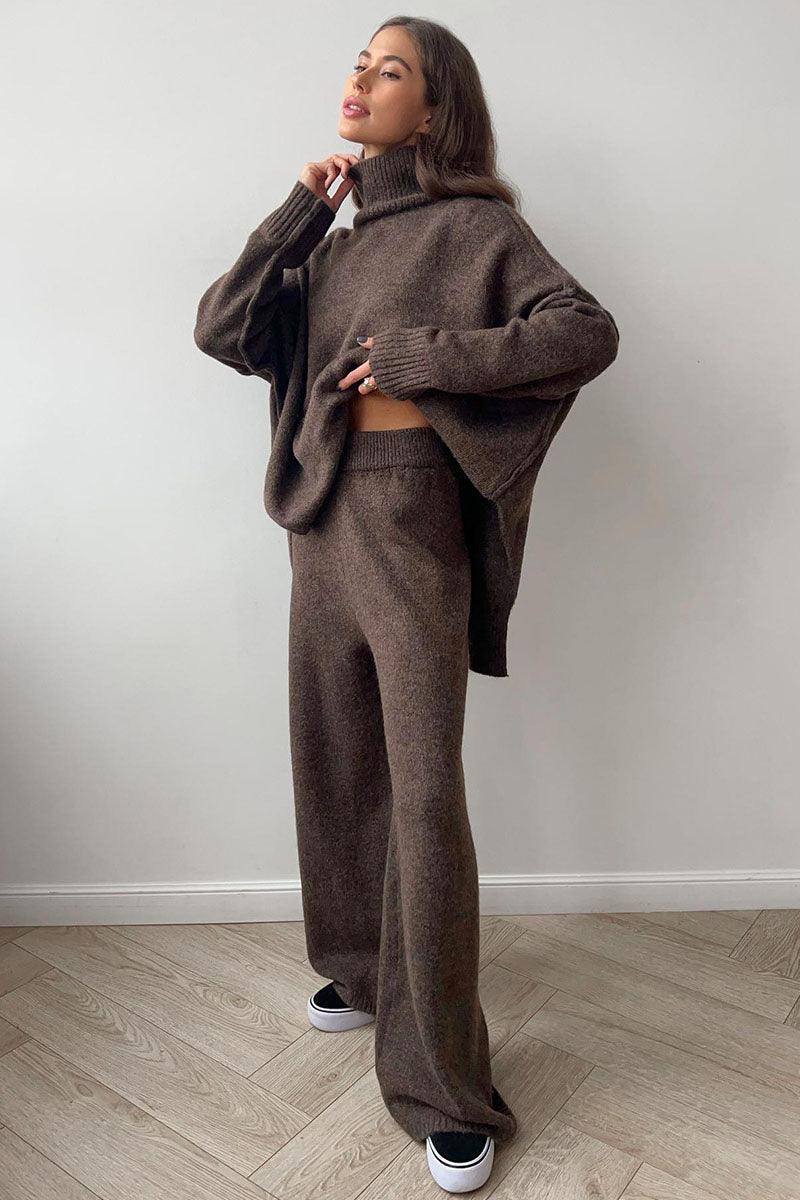 Yüksek Yaka Yırtmaçlı Kazak Bol Örgü Pantolon Takımı
