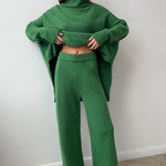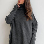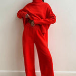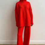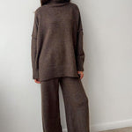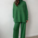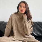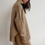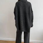 Balıkçı Yaka Yırtmaçlı Kazak Gevşek Örgü Pantolon Seti, rahat, sofistike ve rahat tarzın mükemmel birleşimidir. Şık bölünmüş tasarıma sahip yüksek yakalı bir kazak ve bol kesim, geniş paçalı örgü pantolon içeren bu set, uzanmak veya gündelik geziler için mükemmel olan lüks ve konforlu bir kıyafet sunuyor. Yumuşak, nefes alabilen kumaş sizi sıcak ve rahat tutarken modern tasarım, rahat görünümünüze şıklık katıyor.