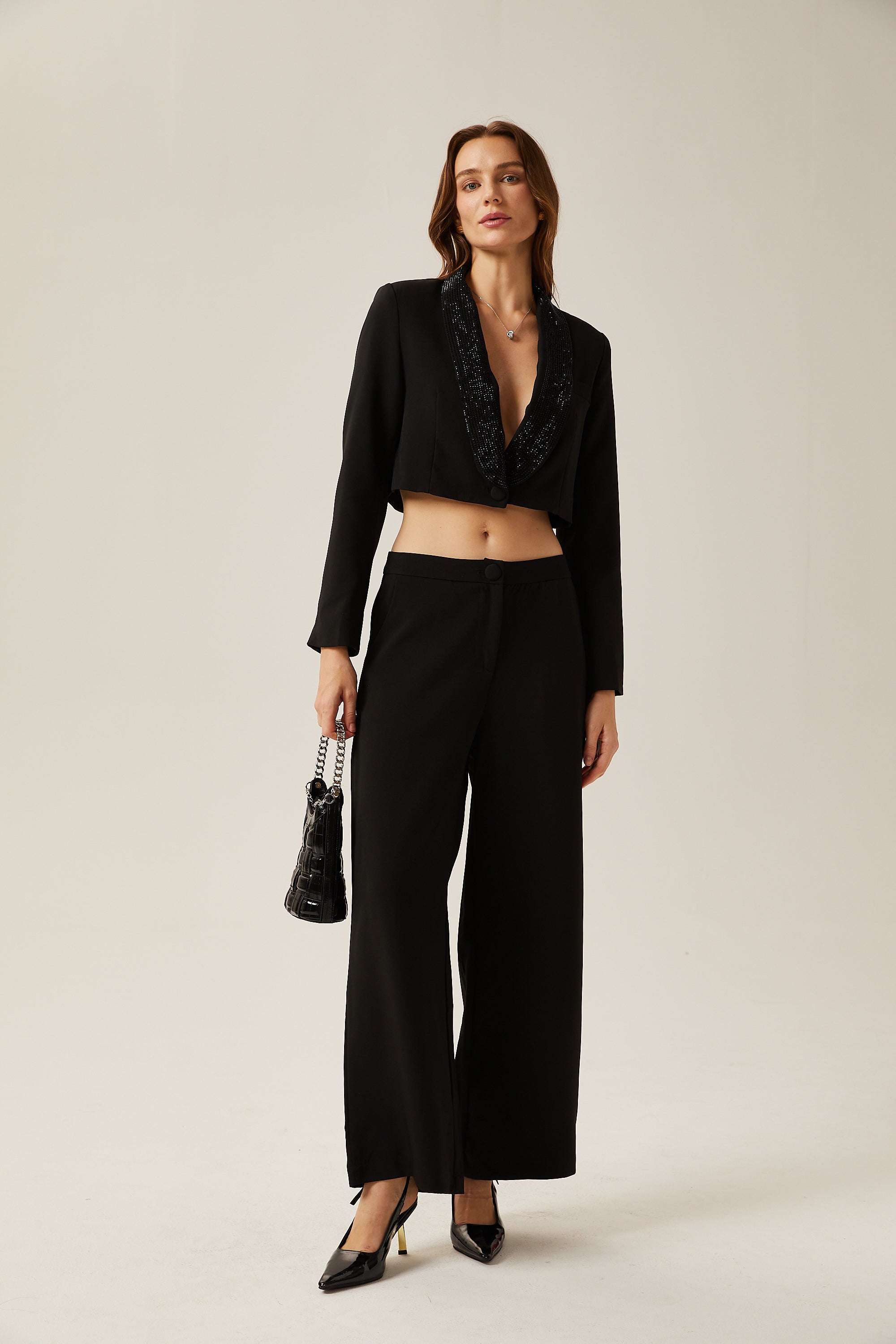 Taş Detaylı Ceket ve Uyumlu Bol Paça Pantolondan Oluşan Zarif Takım – Siyah