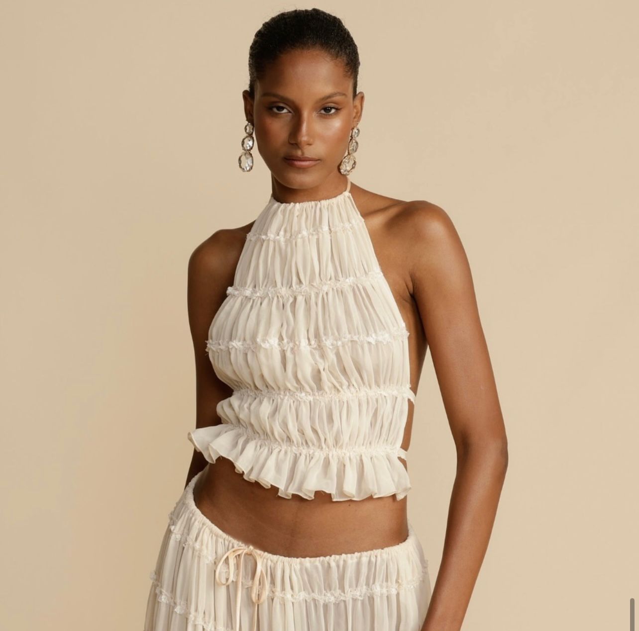 Beyaz Halter Yaka Bağlamalı Şortlu Takım