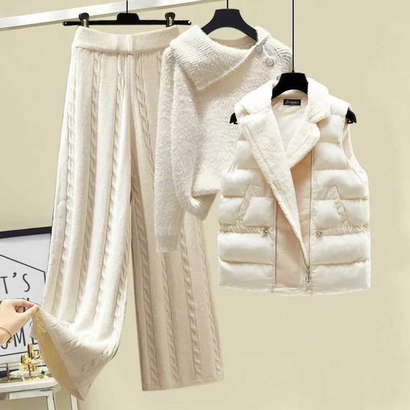 Kışlık Sıcak 3'lü Takım Kazak + Geniş Paça Pantolon + Kuzu Yelek Örme Takım