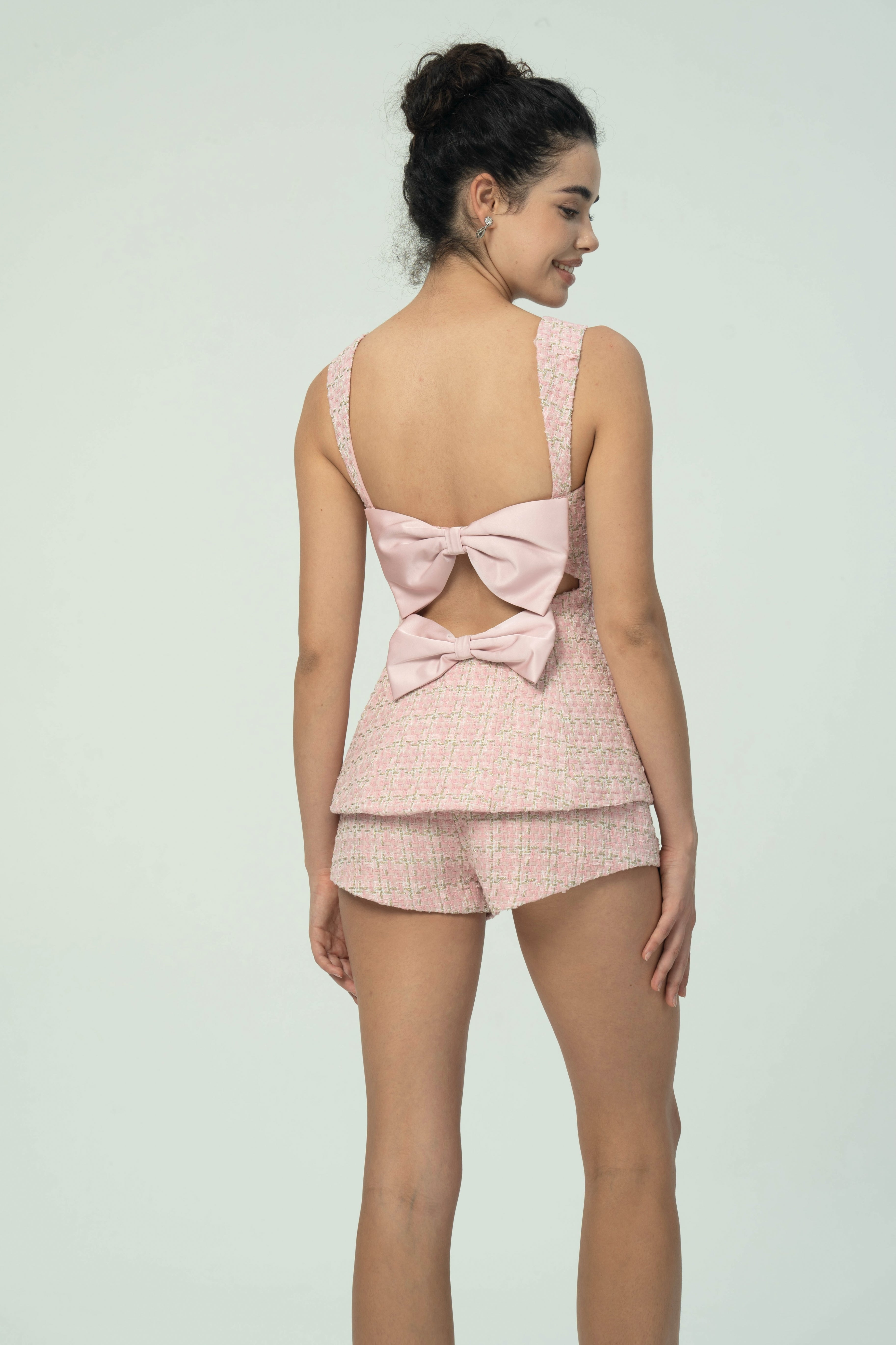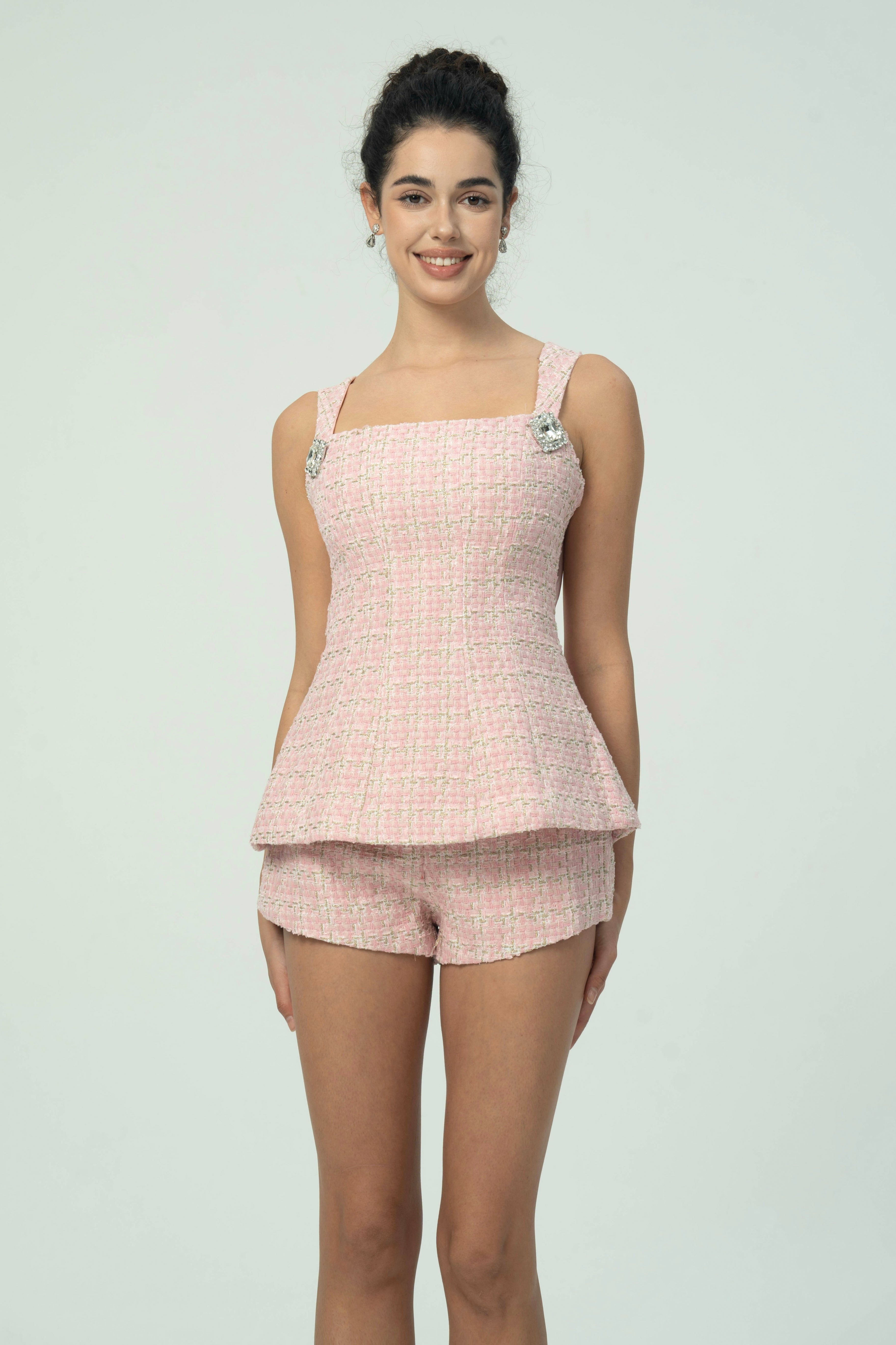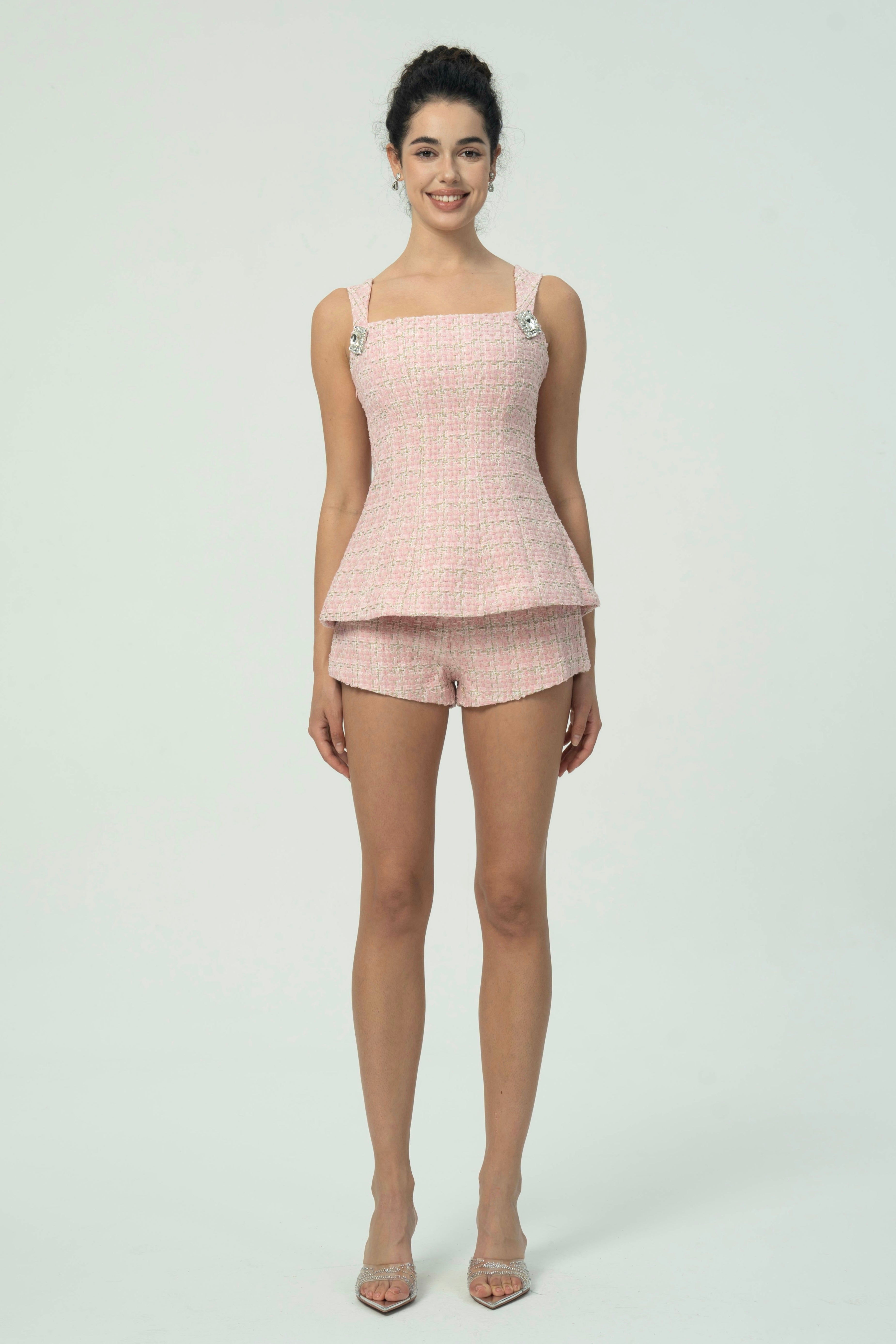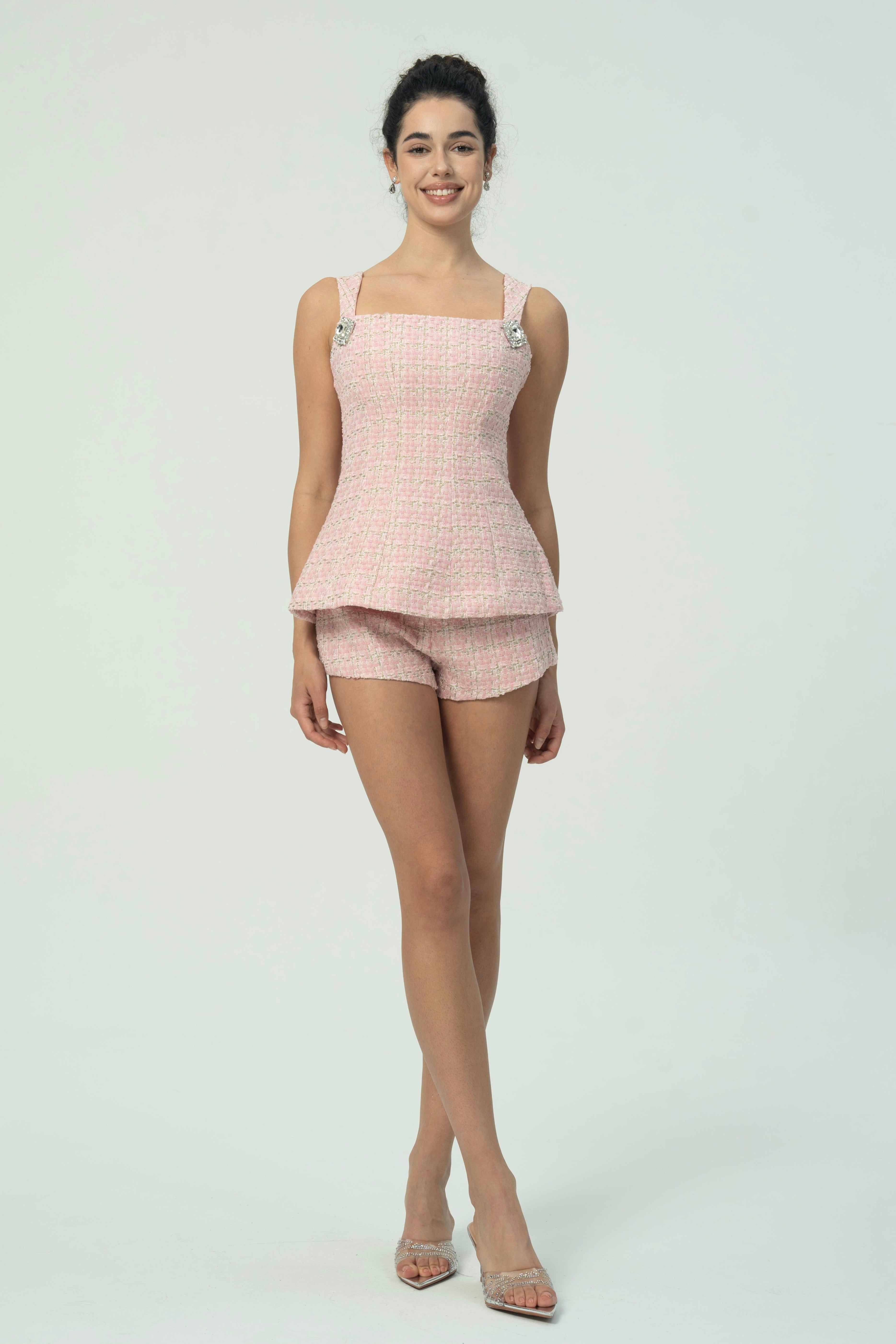 Bu şık pembe tüvit şort takımı, modern blazer kesimi ve arka kısımdaki çift fiyonk detayı ile sofistike ve feminen bir tarz sunuyor. Lüks tüvit kumaşı, şık bir doku ve kaliteli bir his sağlarken, eşleşen blazer ve şort kombini hem resmi hem de yarı resmi ortamlar için mükemmel bir seçimdir.