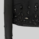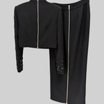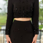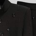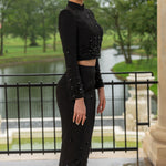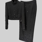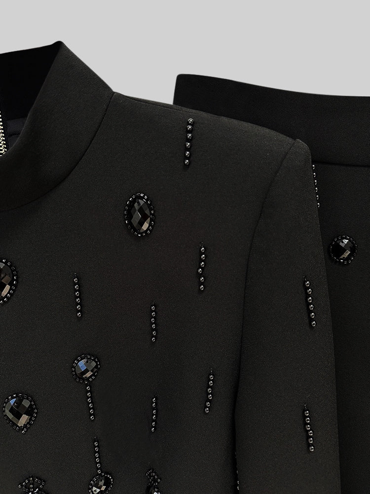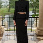 Lüksün tadını çıkarın! Siyah iki parçalı elmas işlemeli takımımız, zarif tasarımıyla öne çıkıyor. Gösterişli elmas detaylarıyla süslenmiş uzun kollu ceket ve yüksek yakasıyla sofistike bir duruş sergiliyor. Arka fermuar detayıyla tamamlanan bu set, mini ve maxi etek seçenekleriyle stilinizi tamamlıyor.