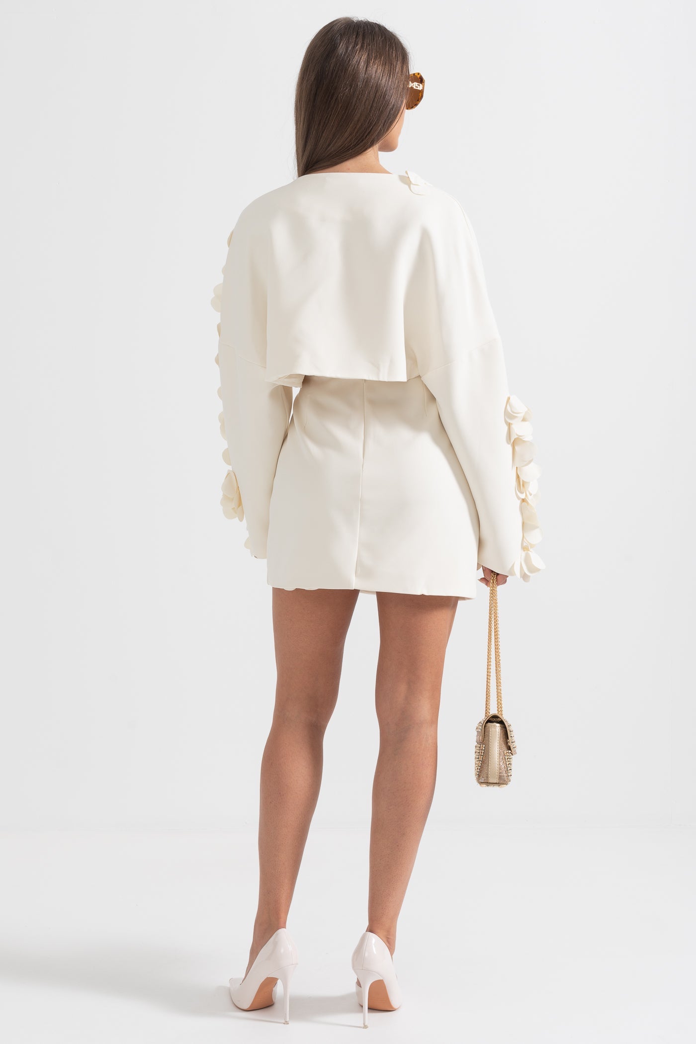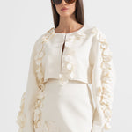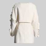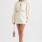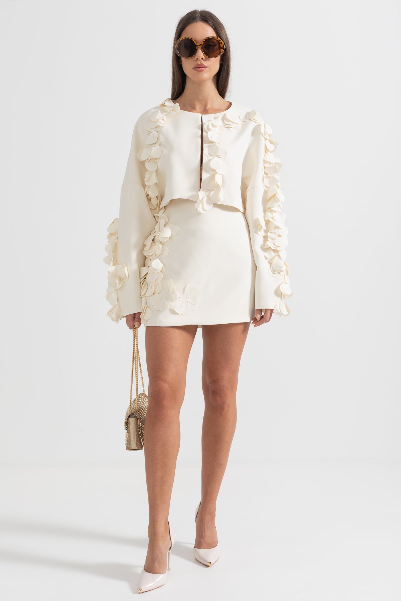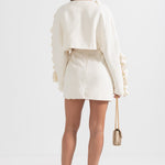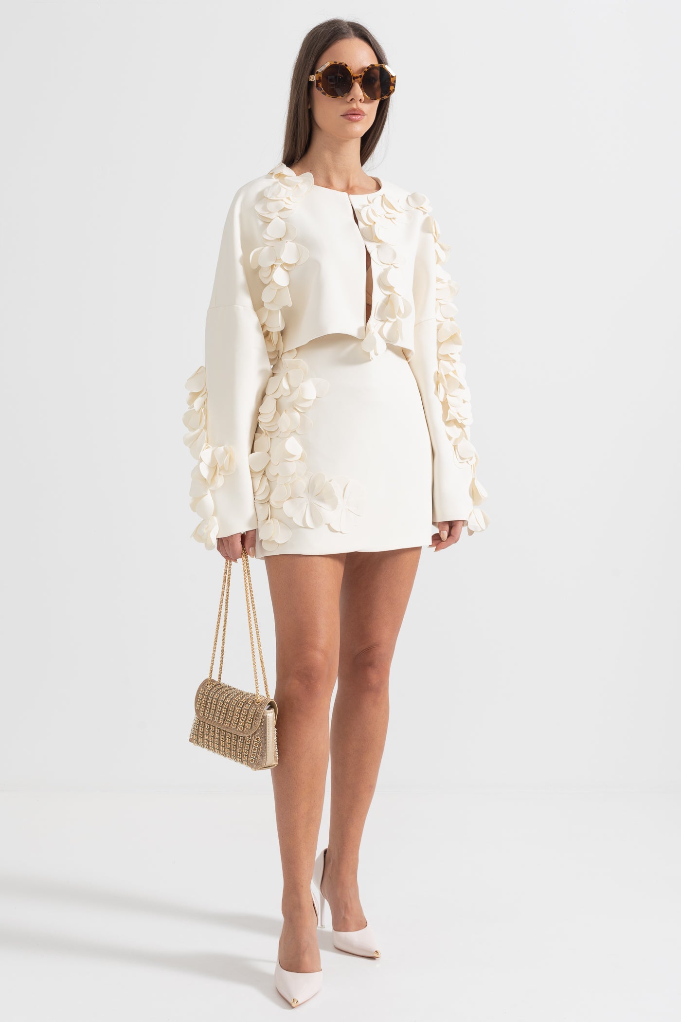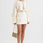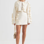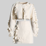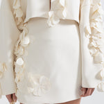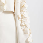 Zarif ve sofistike tasarımıyla öne çıkan Bej İki Parçalı Takım, modern kesimi ve 3D yaprak benzeri işlemeleriyle dikkat çekiyor. Dokulu kumaşı, lüks bir his sunarken, kısa blazer ceketi ve yüksek belli eteğiyle feminen ve güçlü bir duruş sağlıyor. Özel davetler ve şık kombinler için mükemmel bir seçim!
