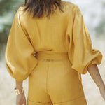 Hafif dokusuyla yaz günlerinin favorisi olan bu beyaz keten playsuit, bağlama detayıyla zarif bir dokunuş sunuyor. Hem plajda hem şehirde şıklığınızı yansıtın!