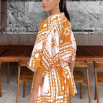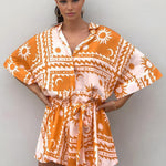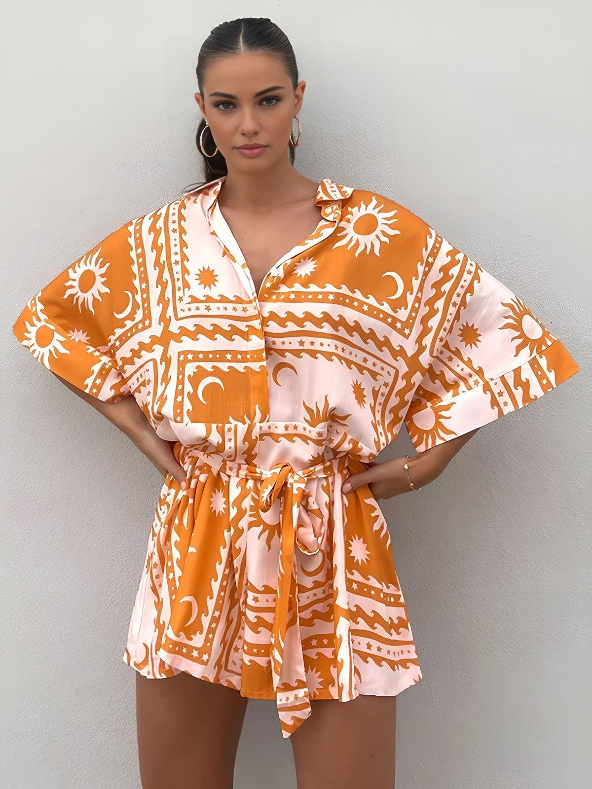 Canlı desenleri ve dökümlü kesimiyle dikkat çeken bu tulum, yaz günlerinde şıklık ve rahatlığı bir araya getiriyor. Hafif kumaşı ve belden bağlamalı tasarımıyla her ortamda zarif bir görünüm sunar.
