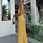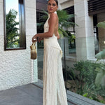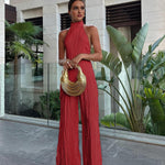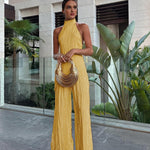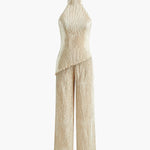 Zarif pliseli dokusu ve halter yaka tasarımıyla dikkat çeken bu krem pantolon takım, şıklığı ve rahatlığı bir araya getiriyor. Özel davetler ve yaz etkinlikleri için ideal bir seçim!