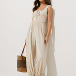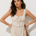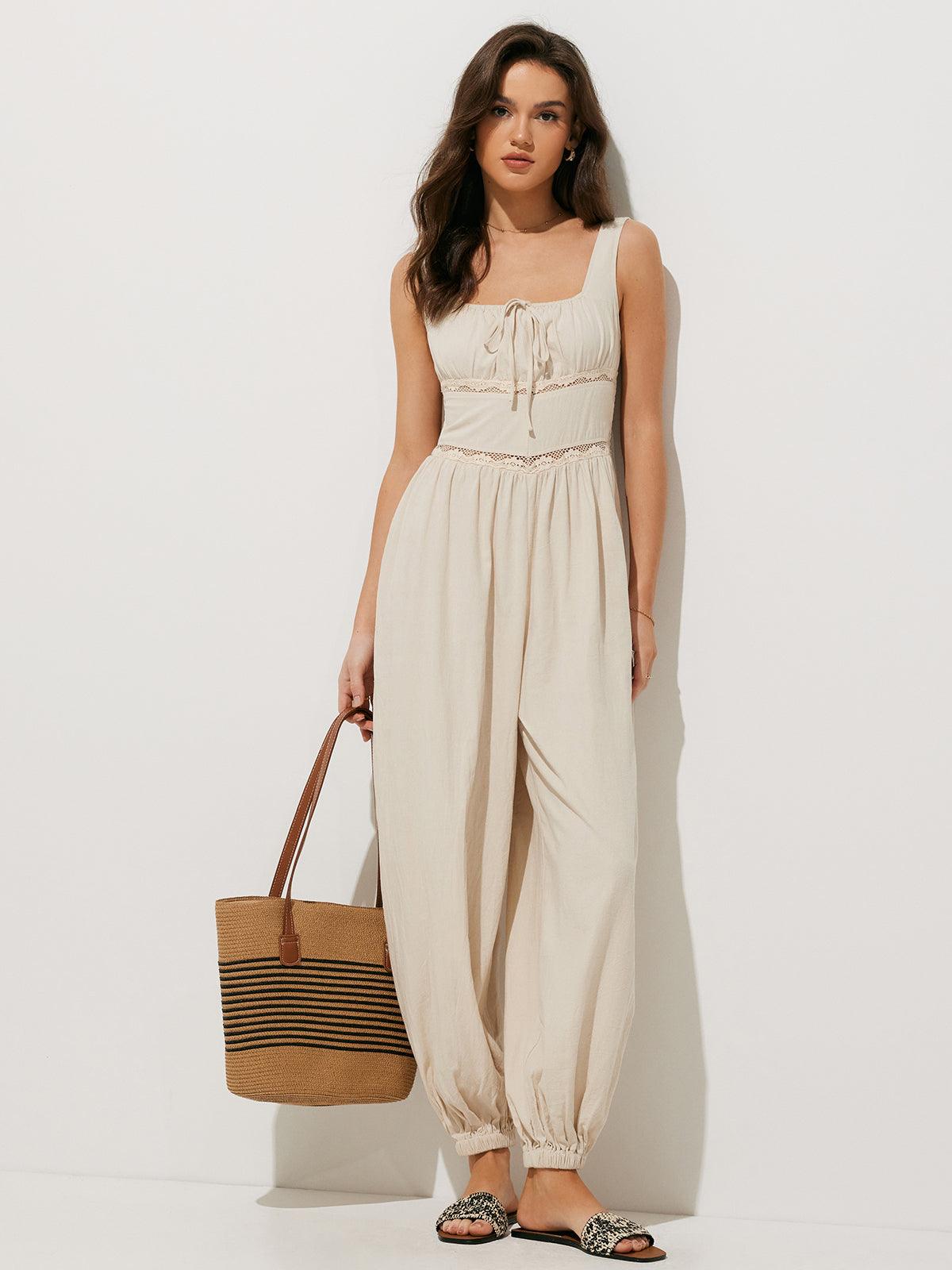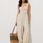 Doğal ve hafif keten dokusuyla tasarlanan bu tulum, yazın sıcak günlerinde hem rahatlık hem de şıklık sunar. Örgü detayları ve esnek beliyle her stile uyum sağlar.
