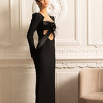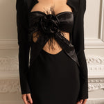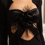 Ürün Başlığı: Siyah Tüy Detaylı Elbise - Işıltılı İşlemeli ve Yüksek Yırtmaçlı