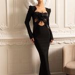 Bu büyüleyici siyah gece elbisesi, korseli ve kupa destekli üst yapısı sayesinde vücudu mükemmel bir şekilde sarar. İnce kesim detayları ve cesur çiçek desenli işlemeleriyle asil bir stil sunar. Yüksek yırtmaç detayı, zarafeti ve şıklığı tamamlar. Tüy süslemeleriyle hareket kazanan bu elbise, her adımda dikkatleri üzerinize çeker. Arka fermuar detayı sayesinde kolayca giyilebilir. Özel davetler ve unutulmaz geceler için ideal bir tercih!