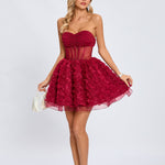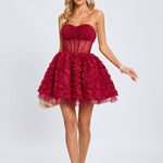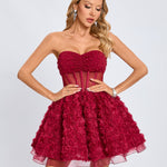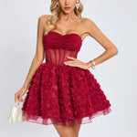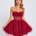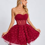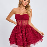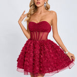 Bu büyüleyici straplez model, inci işlemeleriyle süslenmiş büzgülü yapılı gövdesiyle lüks bir duruş sergiler. Transparan korse panelleri siluetinizi zarifçe vurgularken, hacimli mini eteği üzerindeki üç boyutlu gül aplikeleri feminen ve rüya gibi bir hava katar. Modern dokunuşlarla tasarlanan bu zarif elbise, özel davetler, romantik akşam yemekleri ya da ışıltılı geceler için kusursuz bir tercih.