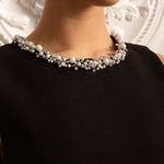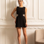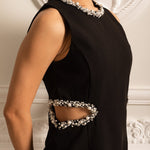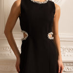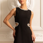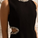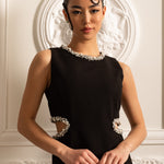 Bu şık siyah mini elbise, inci işlemeli yakası ve bel kısmındaki zarif inci detaylarıyla dikkat çeker. Yan kısımlardaki dekolteler, vücudunuzu kusursuzca şekillendiren modern ve göz alıcı bir silüet yaratır. Şık eteği ve arka fermuar detayı sayesinde kolayca giyilebilir. Özel davetlerde ve şık etkinliklerde kendinizi harika hissetmek için ideal bir seçim!