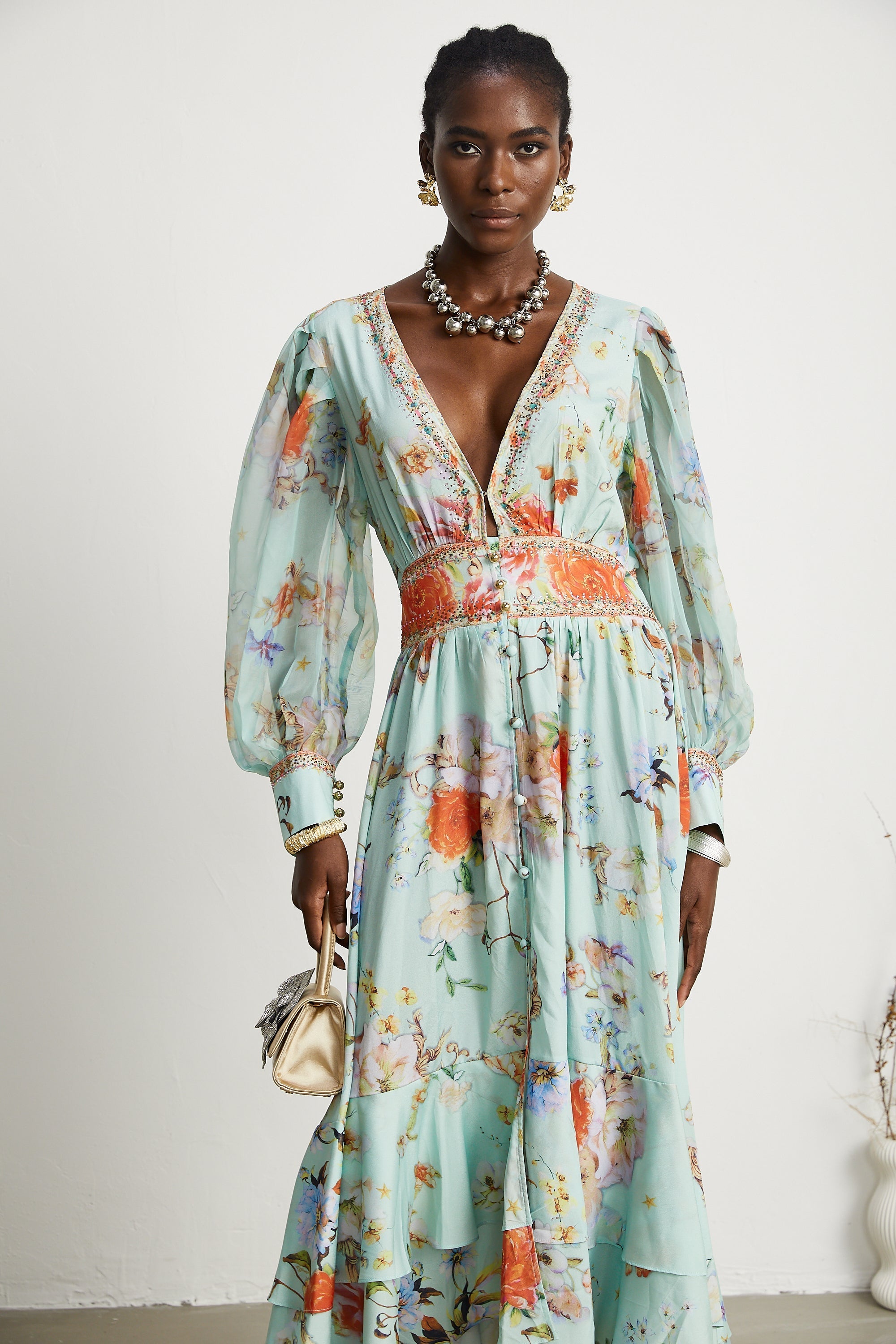 Jailina Çiçekli V Yaka Uzun Kollu Maxi Elbise
