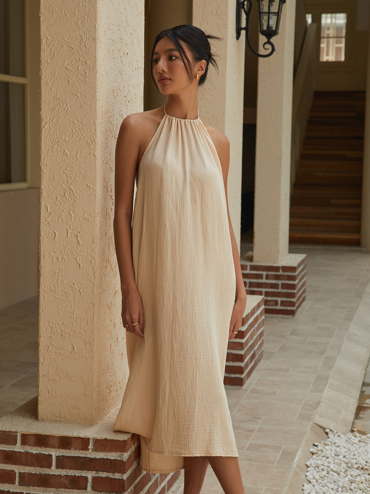 Pamuk Karışımlı Sırtı Açık Halter Midi Elbise
