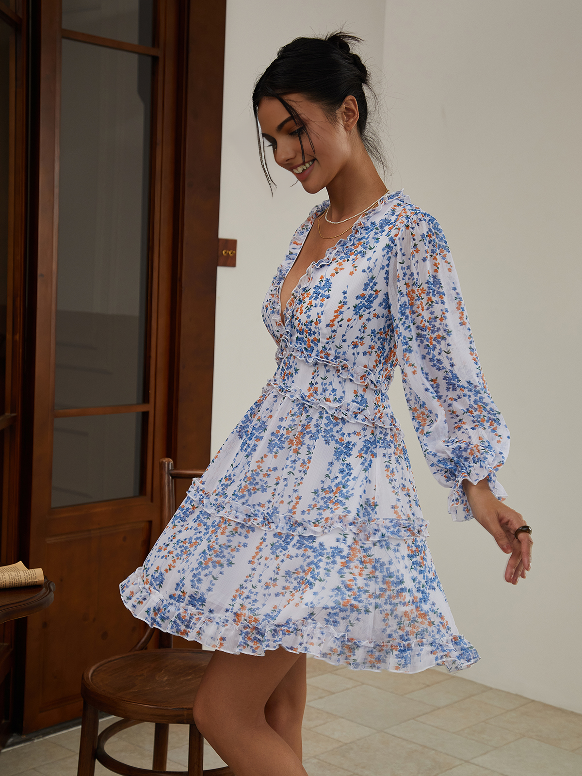 Çiçek Desenli Fırfırlı Etek Düğümlü Kısa Elbise