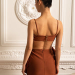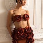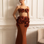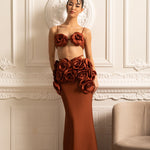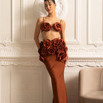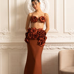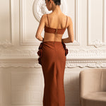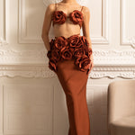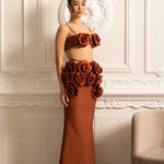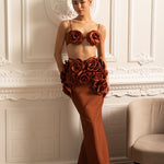 Bu büyüleyici kahverengi saten ikili takım, zarif saten dokusu ve detaylı 3D çiçek işlemeleriyle göz alıcı bir şıklık sunar. Çiçek motifleriyle süslenmiş büstiyeri ve maxi etek kesimi sayesinde asil bir silüet yaratır. İkili takımın her iki parçası da arka fermuarlarla kolayca giyilebilir. Özel davetlerde ve şık organizasyonlarda dikkatleri üzerine çekmek isteyenler için mükemmel bir tercih!