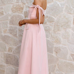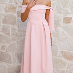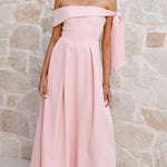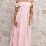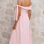 This elegant midi dress features an off-shoulder silhouette with a fold and side tie accent at the bust. It includes a silicone grip strip for secure wear, an invisible zip at the back, and a fully lined maxi-length design.