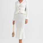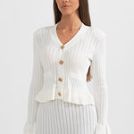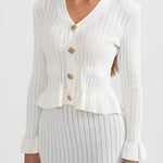 Zamansız şıklığıyla öne çıkan bu beyaz triko takım, zarif detaylarıyla feminen bir görünüm sunuyor. V yaka tasarımlı fırfır detaylı hırka, boyun hattını zarifçe vurgularken; manşet ve etek ucundaki fırfırlar romantik bir dokunuş katıyor. Öndeki dört düğmeli kapama vintage bir cazibe oluştururken, yüksek bel uyumlu mini etek kusursuz bir siluet yaratır. Diz boyundaki kloş kesim ve fırfırlı etek ucu ise feminenliği ön plana çıkarır. Takımın tamamında kullanılan ribana dokusu, sofistike ve modern bir görünüm kazandırır.