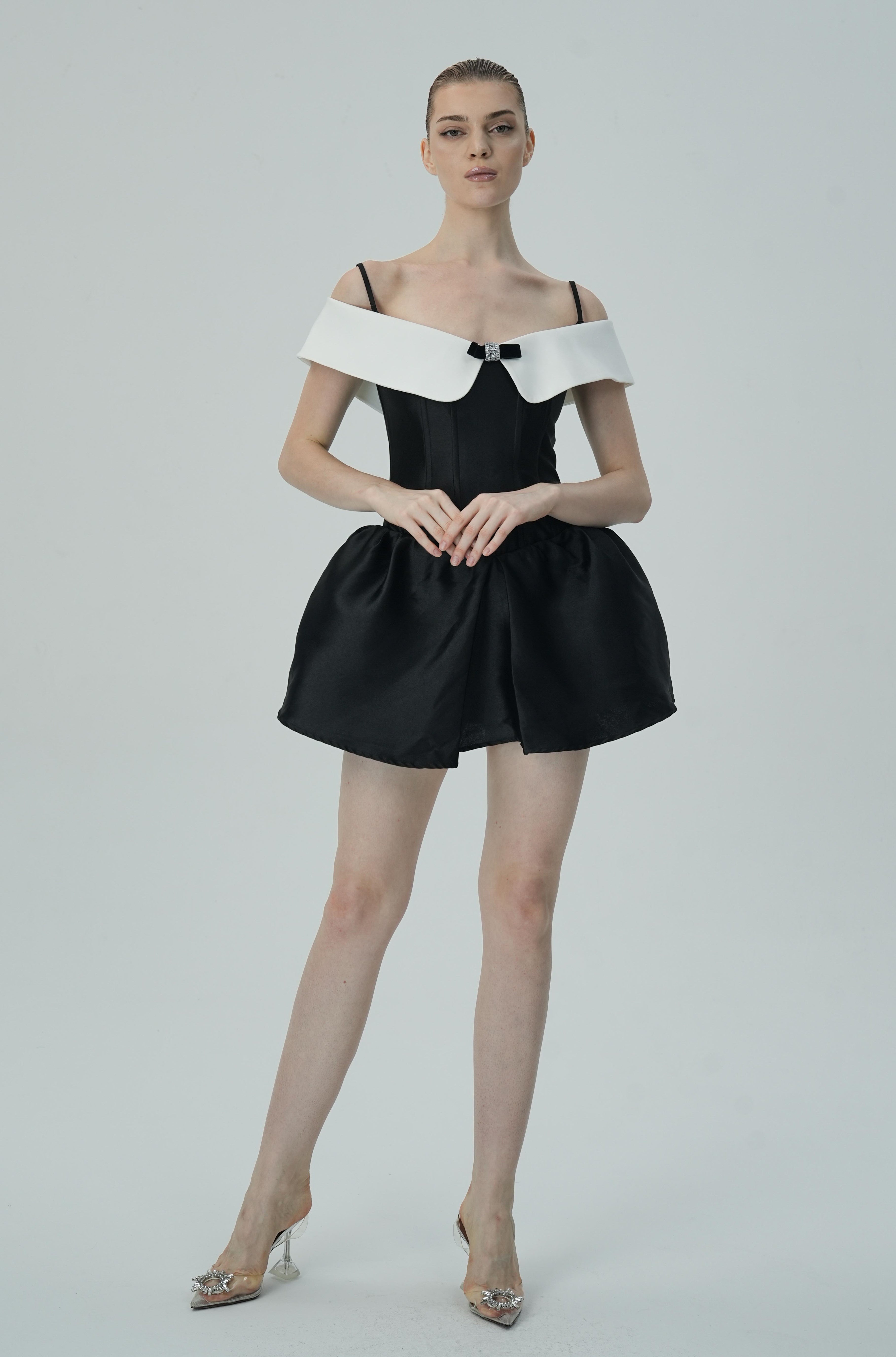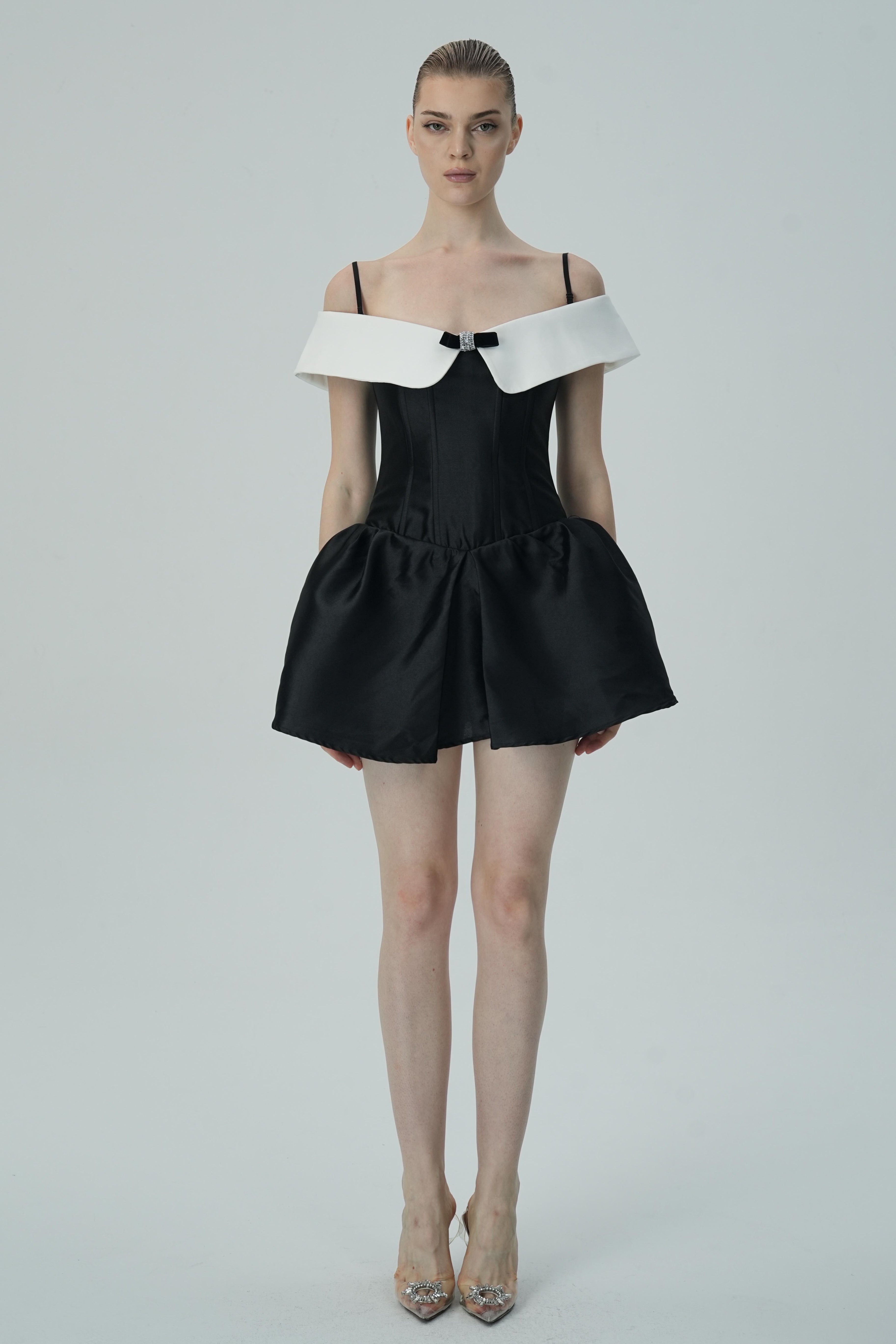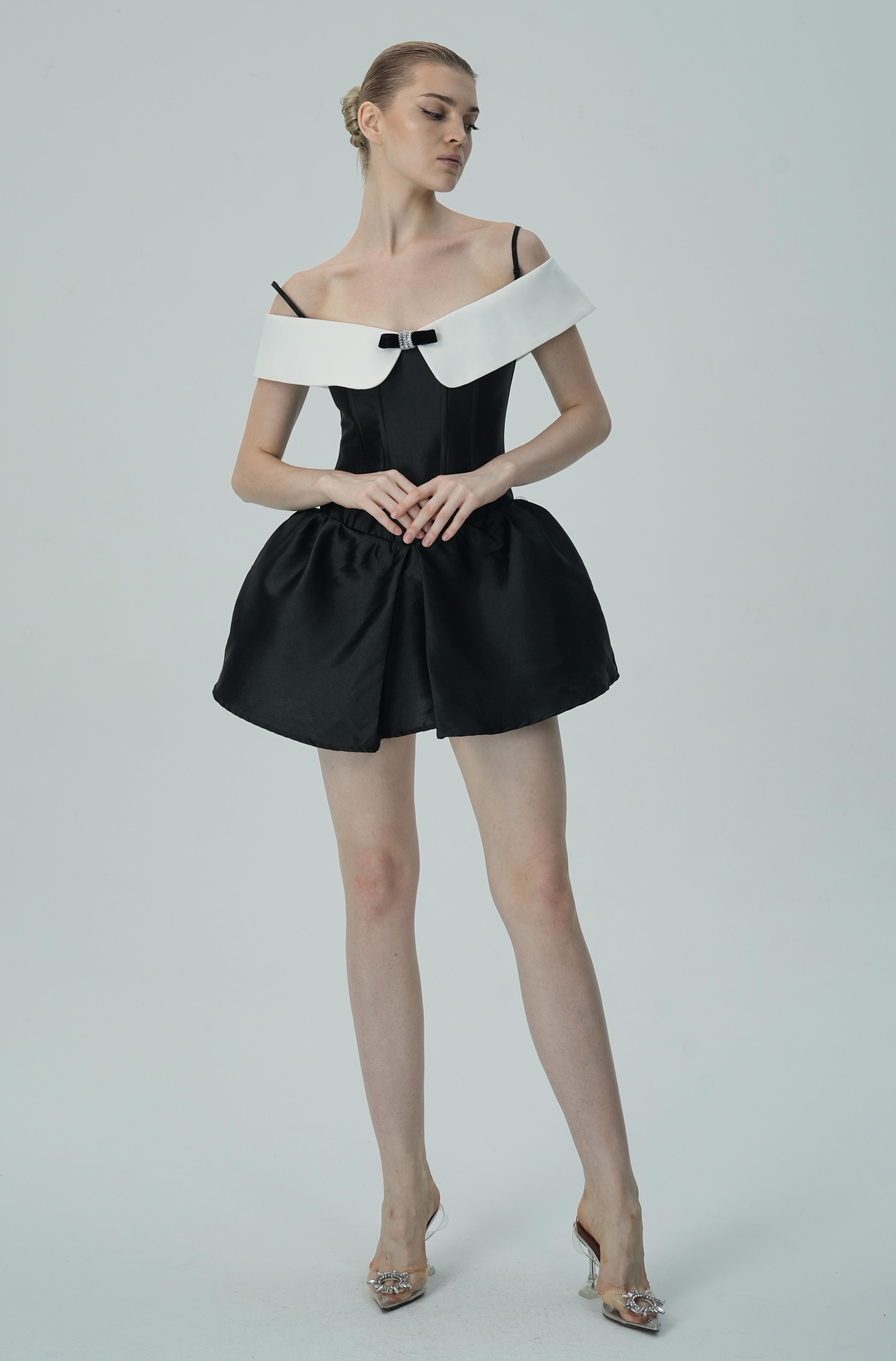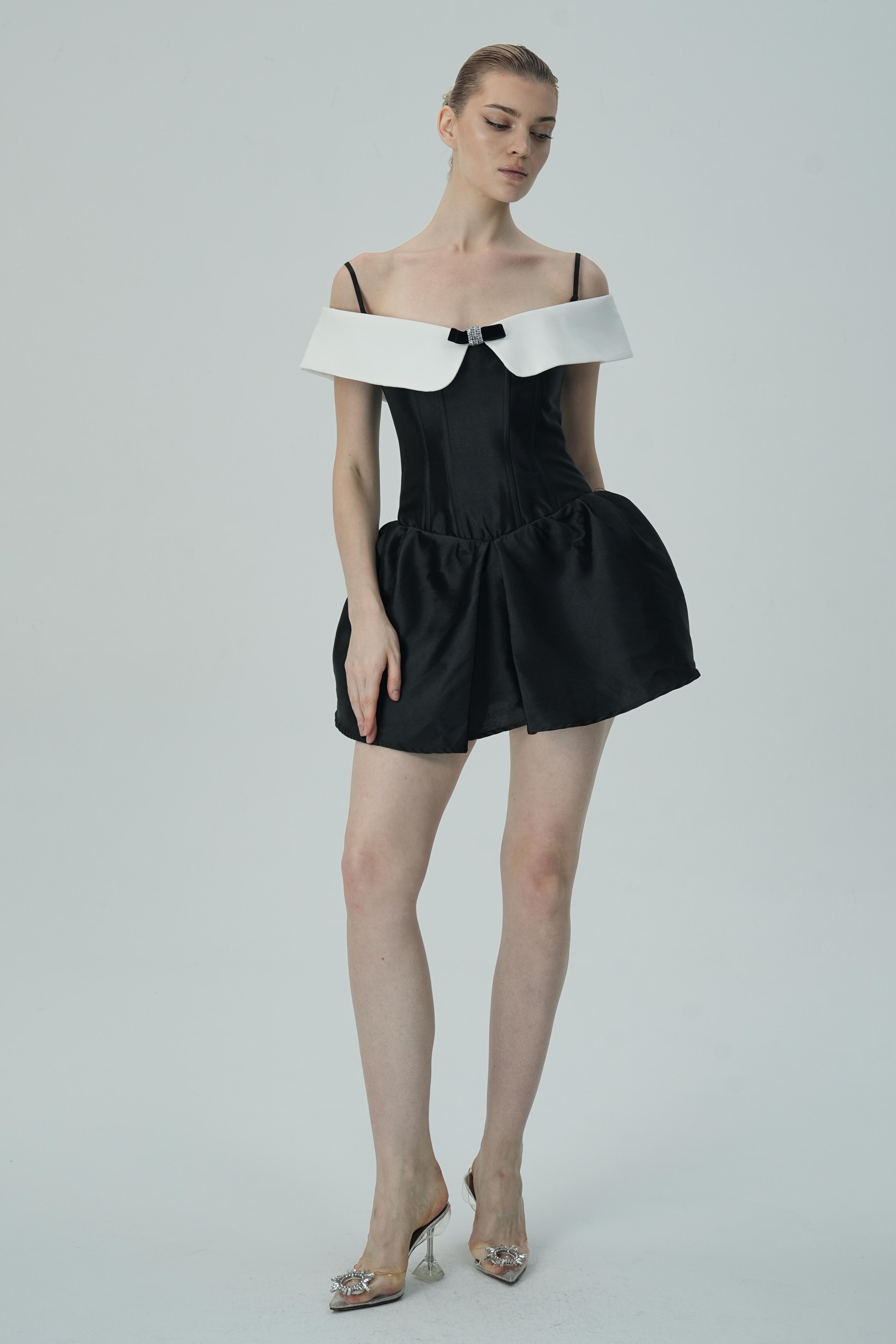 Bu şık siyah mini elbise, dikkat çeken beyaz omuzsuz yaka detayı, parlak saten kumaşı ve kabarık etek kesimiyle hem zarif hem de iddialı bir görünüm sunuyor. Vücuda oturan korsaj kesimi beli ön plana çıkararak kusursuz bir siluet oluştururken, ince askıları dengeleyici bir zarafet katıyor.