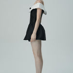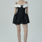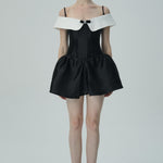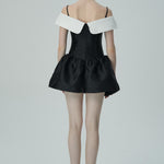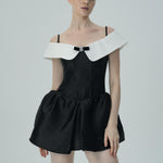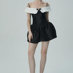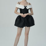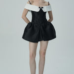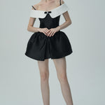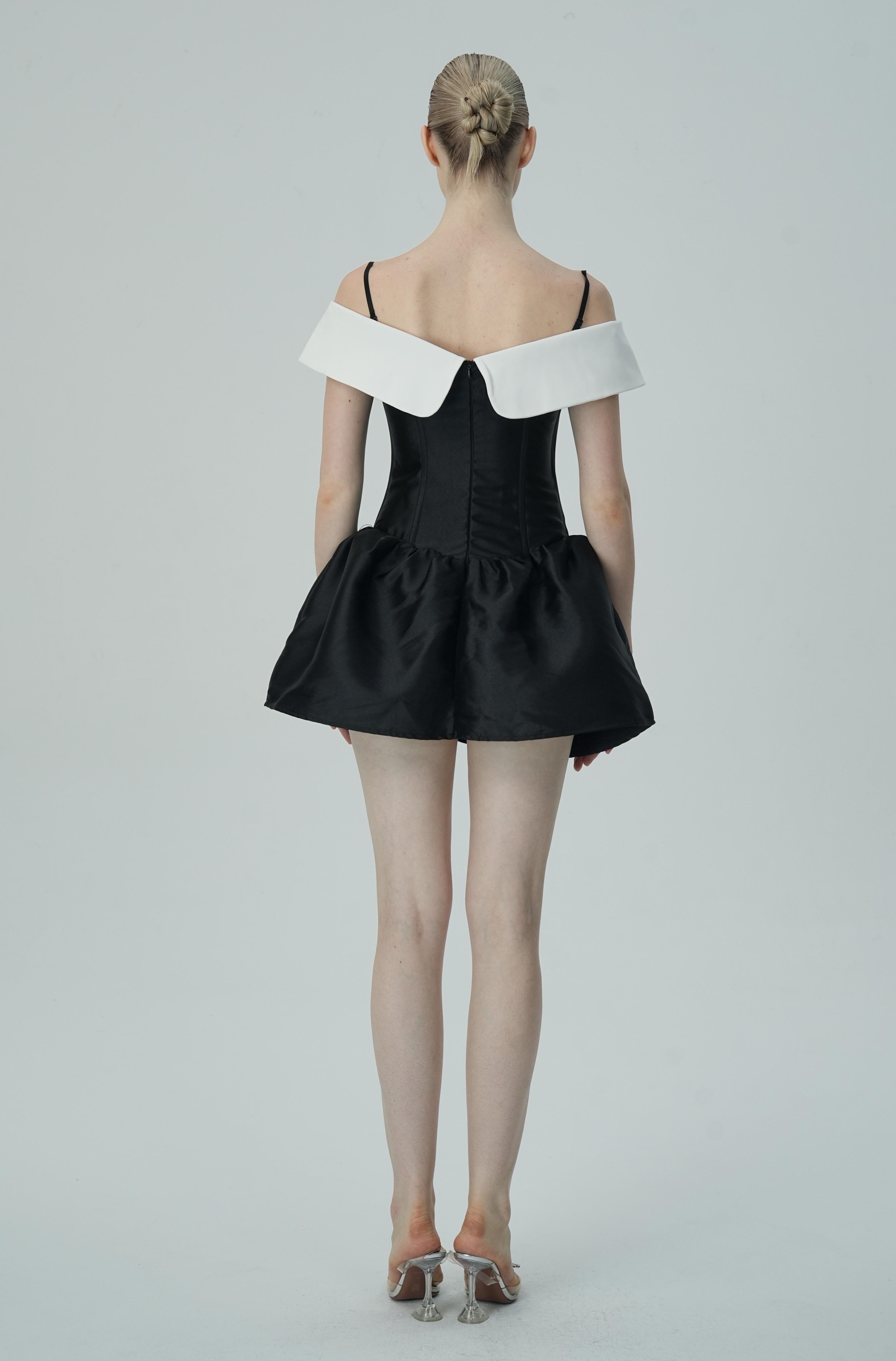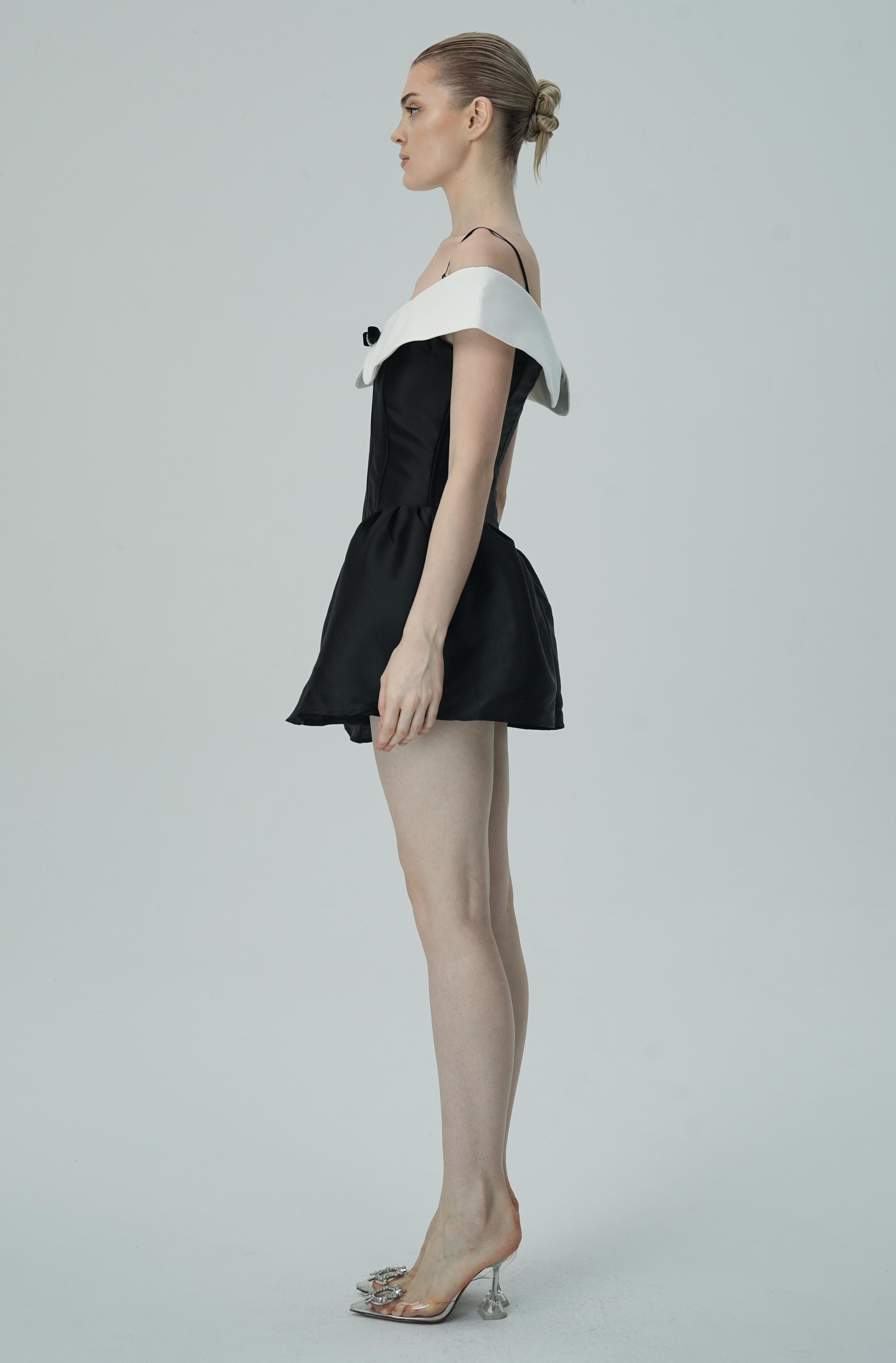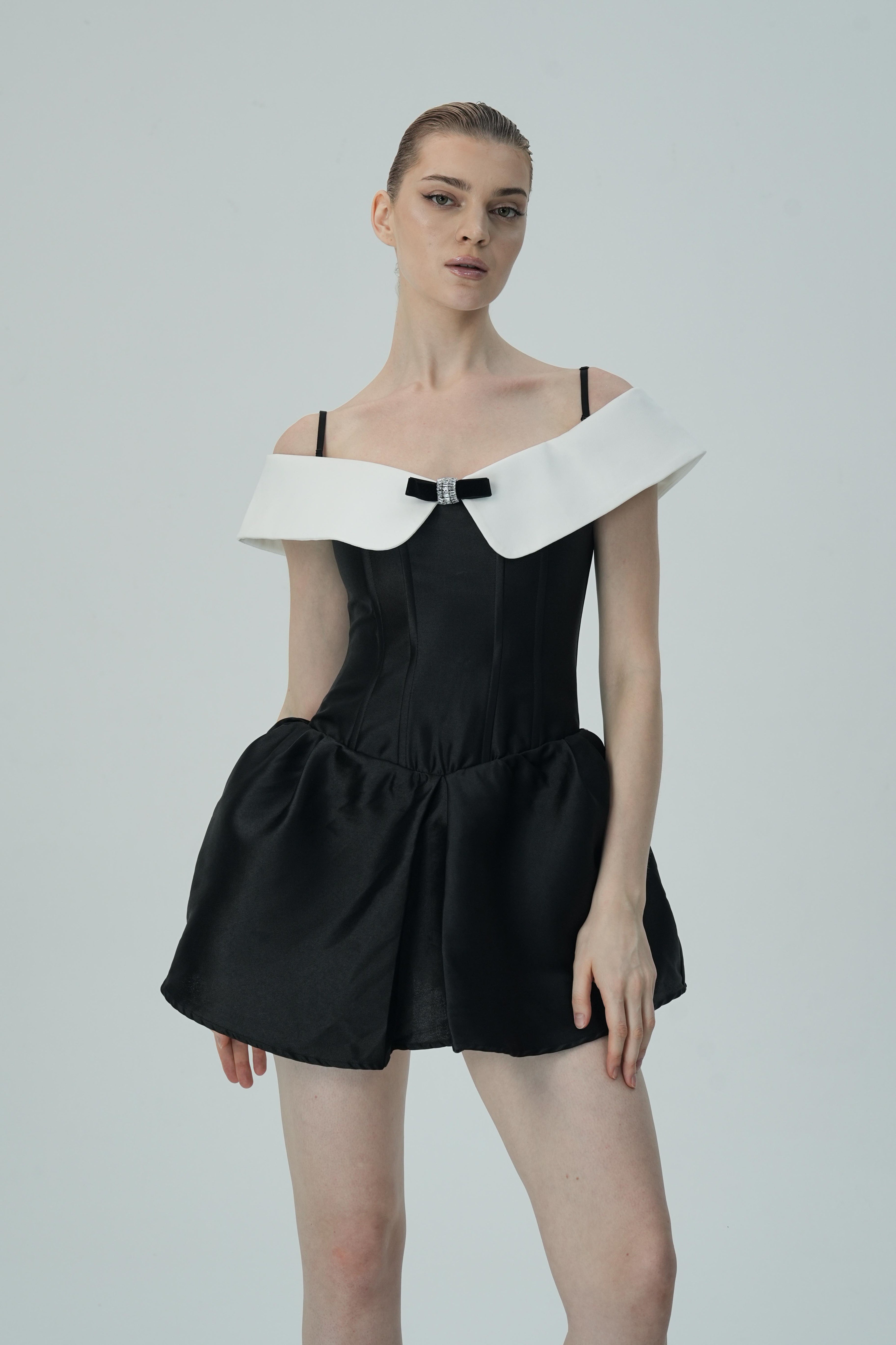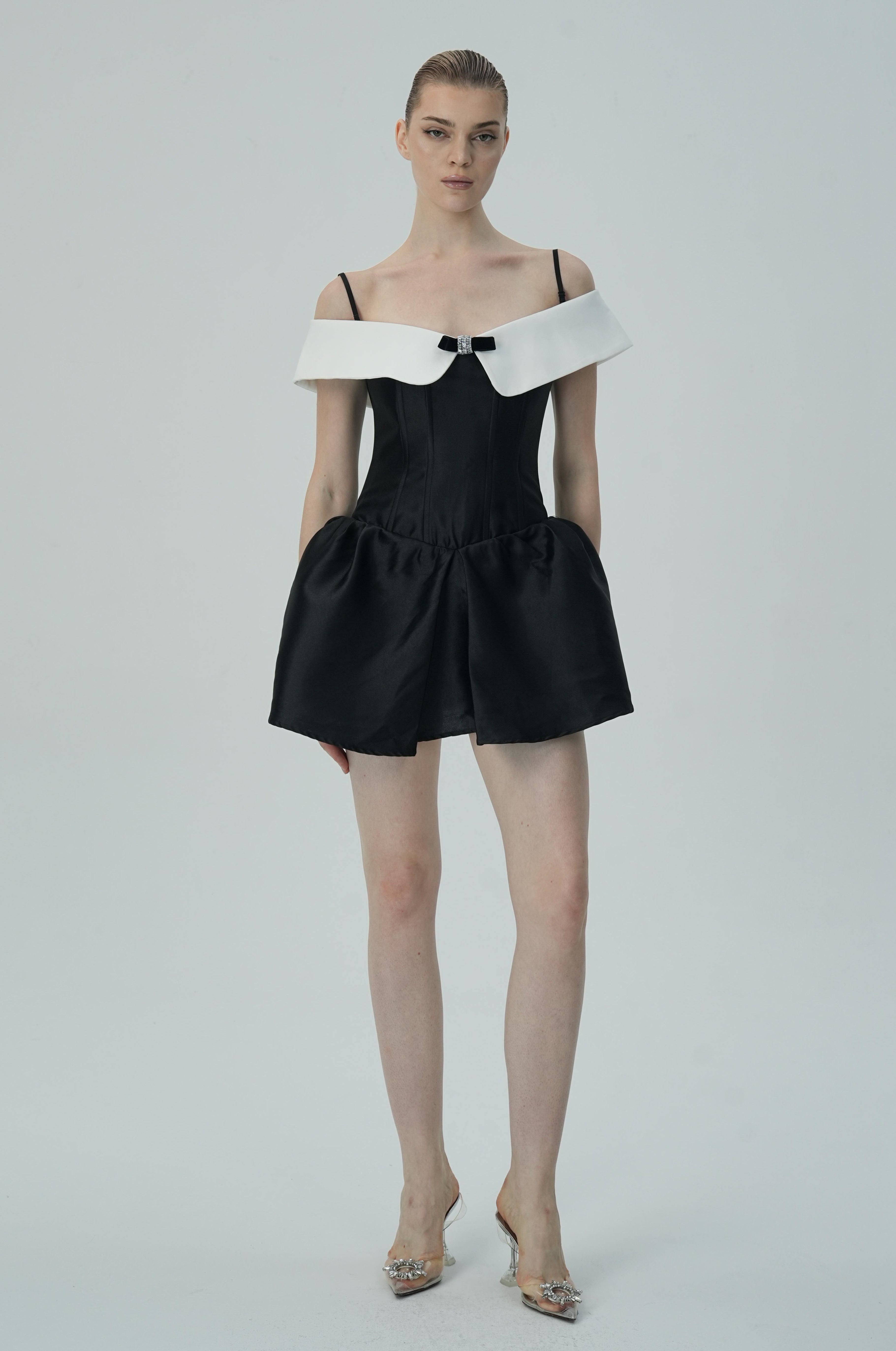 Bu şık siyah mini elbise, dikkat çeken beyaz omuzsuz yaka detayı, parlak saten kumaşı ve kabarık etek kesimiyle hem zarif hem de iddialı bir görünüm sunuyor. Vücuda oturan korsaj kesimi beli ön plana çıkararak kusursuz bir siluet oluştururken, ince askıları dengeleyici bir zarafet katıyor.