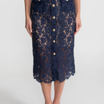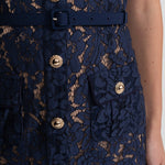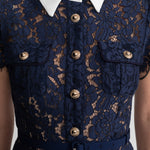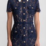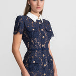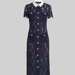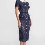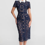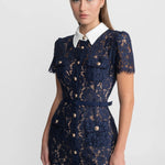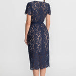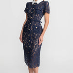 Lacivert Çiçek Dantelli, Gömlek Yaka ve Kemerli Midi Elbise
