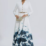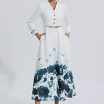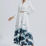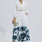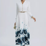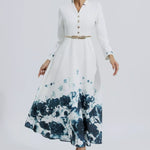 Feminen ve zarif bir stil sunan bu mavi tonlu maxi elbise, üzerinde yer alan beyaz çiçek desenleriyle göz alıcı bir görünüm sağlar. Bel kısmındaki uyumlu kuşak, silueti nazikçe şekillendirir ve şıklığı tamamlar. Günlük kombinlerden özel davetlere kadar rahatlıkla tercih edilebilecek bu elbise, moda tutkunlarının gardırobunda olmazsa olmaz bir parçadır.
