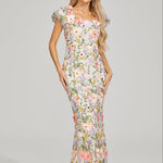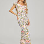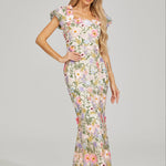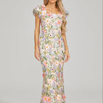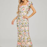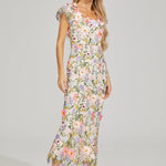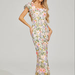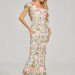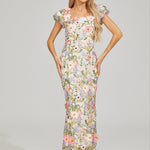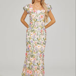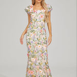 Zamansız zarafet ve romantik bir duruş sunan bu çiçek işlemeli maxi elbise, pastel pembe, mor ve yeşil tonlarının ince işçiliğiyle öne çıkar. Kare yaka ve kabarık kollar vintage bir çekicilik katarken, vücuda oturan modern kesimi silueti zarifçe vurgular. Bahçe partileri veya şık akşam davetleri için ideal bir tercih olan bu elbise, feminen sofistike stilinizi tamamlayacak zamansız bir parçadır.