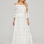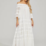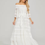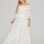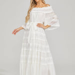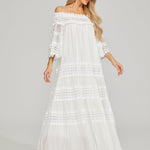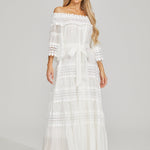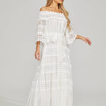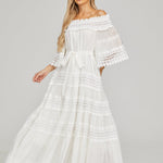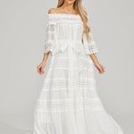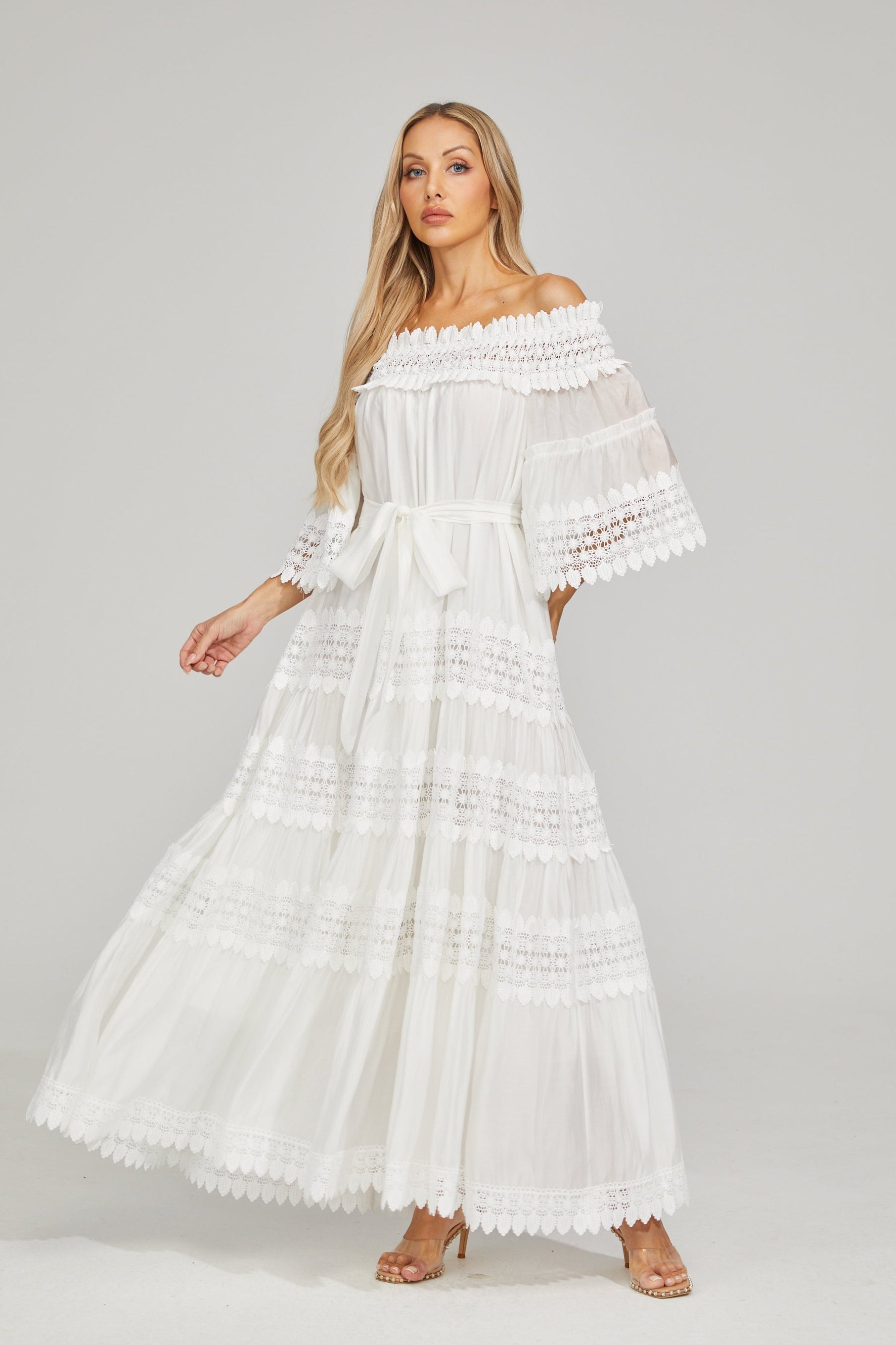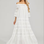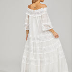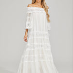 Zarif ve hafif bir siluet sunan bu omuz dekolteli maxi elbise, yumuşak pileli yakası ve katlı dantel panelleri ile öne çıkar. Etek uçlarındaki fırfır ve dantel detayları tasarıma romantik bir dokunuş katarken, ince bel bağı vücudu nazikçe kavrayarak feminen bir siluet oluşturur. Hafif ve hava alan kumaşı, plaj düğünleri, bahçe brunchları veya özel akşam etkinlikleri için ideal bir tercih sunar.