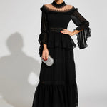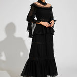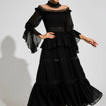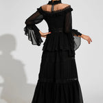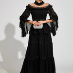 Dantel Uzun Kollu Maxi Elbise, zarafet ve sofistike bir şıklıkla tasarlanmıştır. Volanlı kolları, omuz açık yakası ve gotik esintili dantel dokusu ile zamansız bir çekicilik sunar. Hem özel davetlerde hem de günlük şıklıkta rahatlıkla tercih edebileceğiniz bu elbise, güzellik ve konforu kusursuz bir şekilde birleştirir. Stilinizde asil ve iddialı bir dokunuş için mükemmel bir seçimdir.