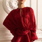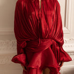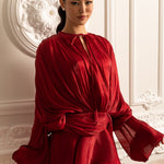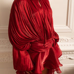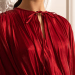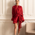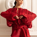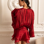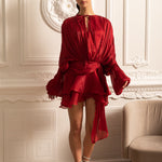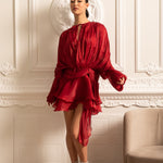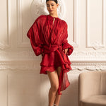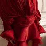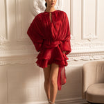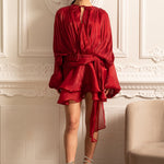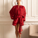 Drapeli Uzun Kollu, Mini Etekli ve Büzgülü Bel Detaylı Elbise – Kırmızı