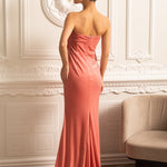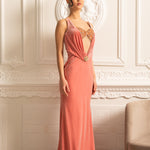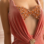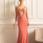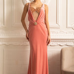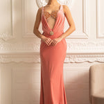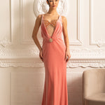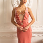 Derin Yaka ve Dekoratif Broş Detaylı Zarif Abiye Elbise – Şeftali