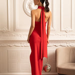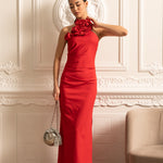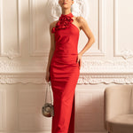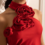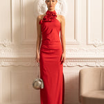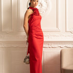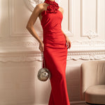3 Boyutlu Güllü ve Yandan Yırtmaçlı Elbise - Kırmızı