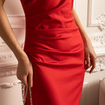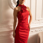 3D Yaka Güllü ve Yandan Yırtmaçlı Kırmızı Fitted Elbise